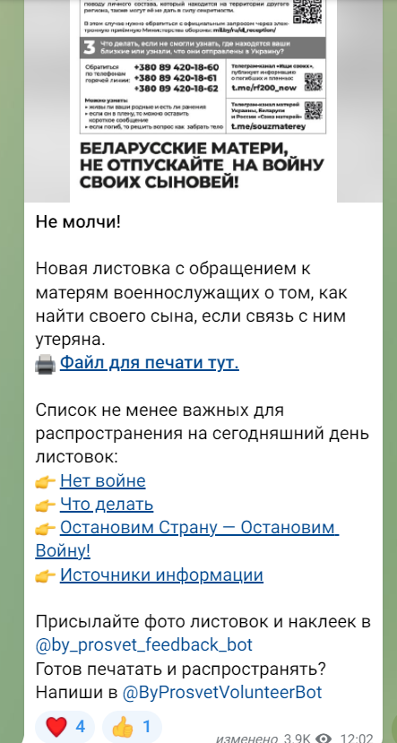 У телеграм-каналах вони розповсюджують листівки із закликами до матерів, щоб ті не відпускали своїх дітей на війну. Листівки кожен може роздрукувати і розповсюдити.
