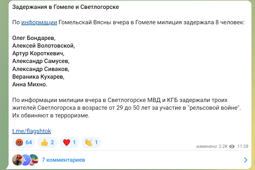 Влада кидає учасників «рейкової війни» за ґрати. Про це сповіщають опозиційні білоруські телеграм-канали.