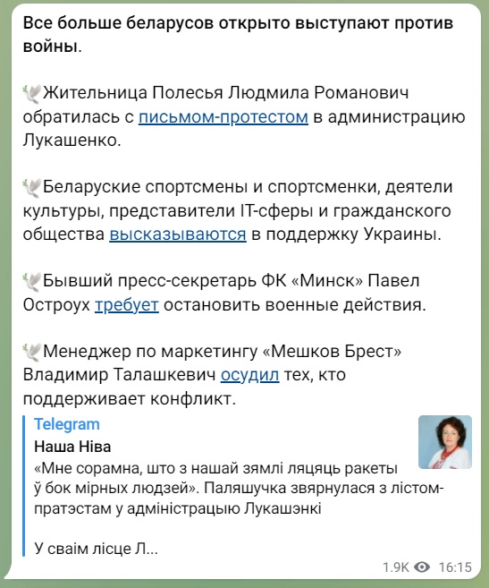 Все більше білорусів відкрито виступають проти війни.