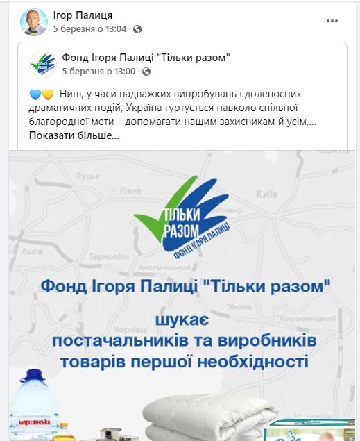 «Я в Україні. Нікуди не виїжджав і не збираюся... Мій Фонд вже виділив 30 мільйонів гривень на закупівлю гуманітарної допомоги, співпрацює з нашими партійцями (представниками партії «За майбутнє» – ред.), які в Гостомелі вивозять наших людей або ж завозить їм їжу.