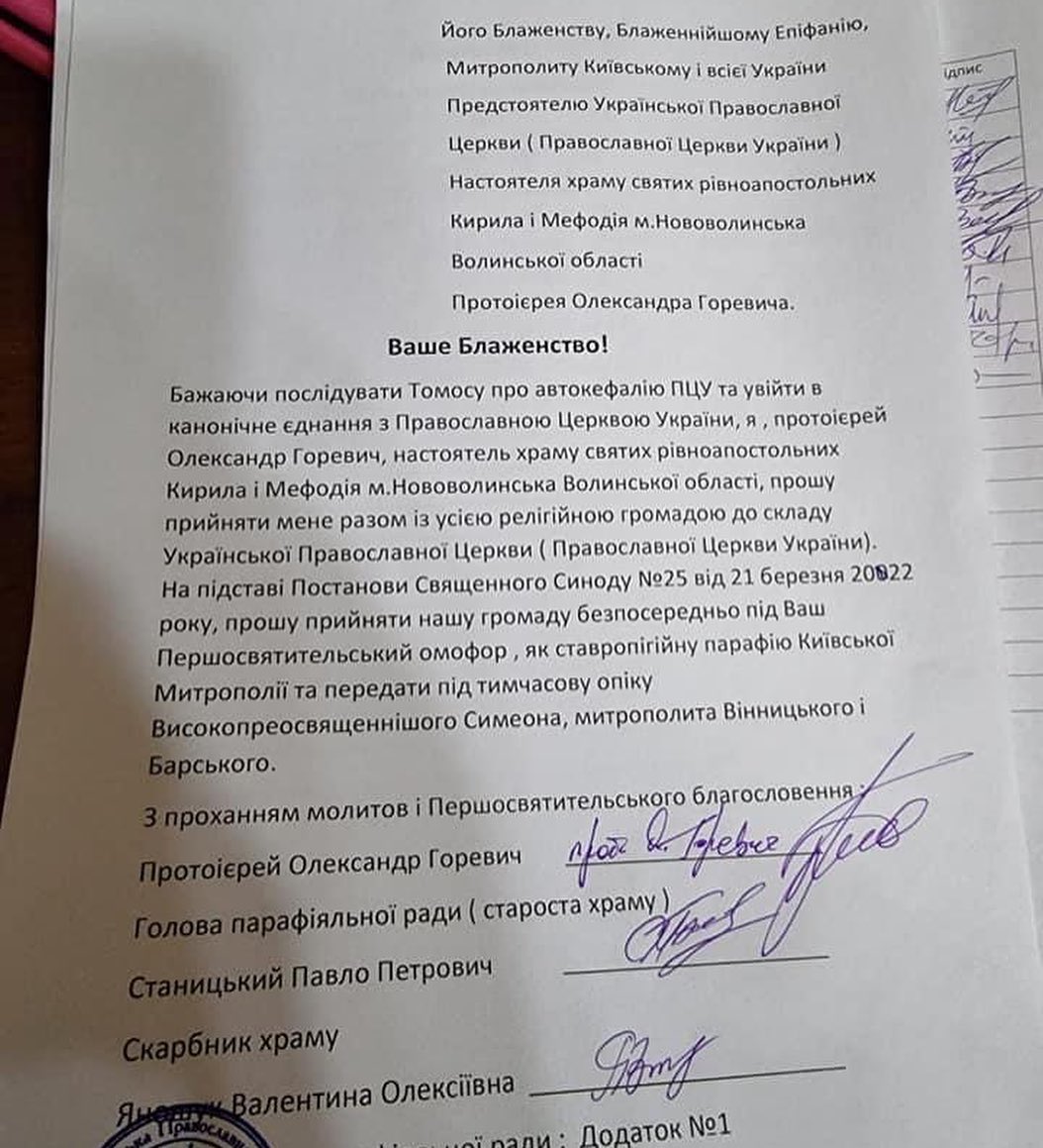 Парафіяльна громада святих рівноапостольних Кирила і Мефодія міста Нововолинська разом із священником вирішила перейти із Московського патріархату до складу Православної церкви України.