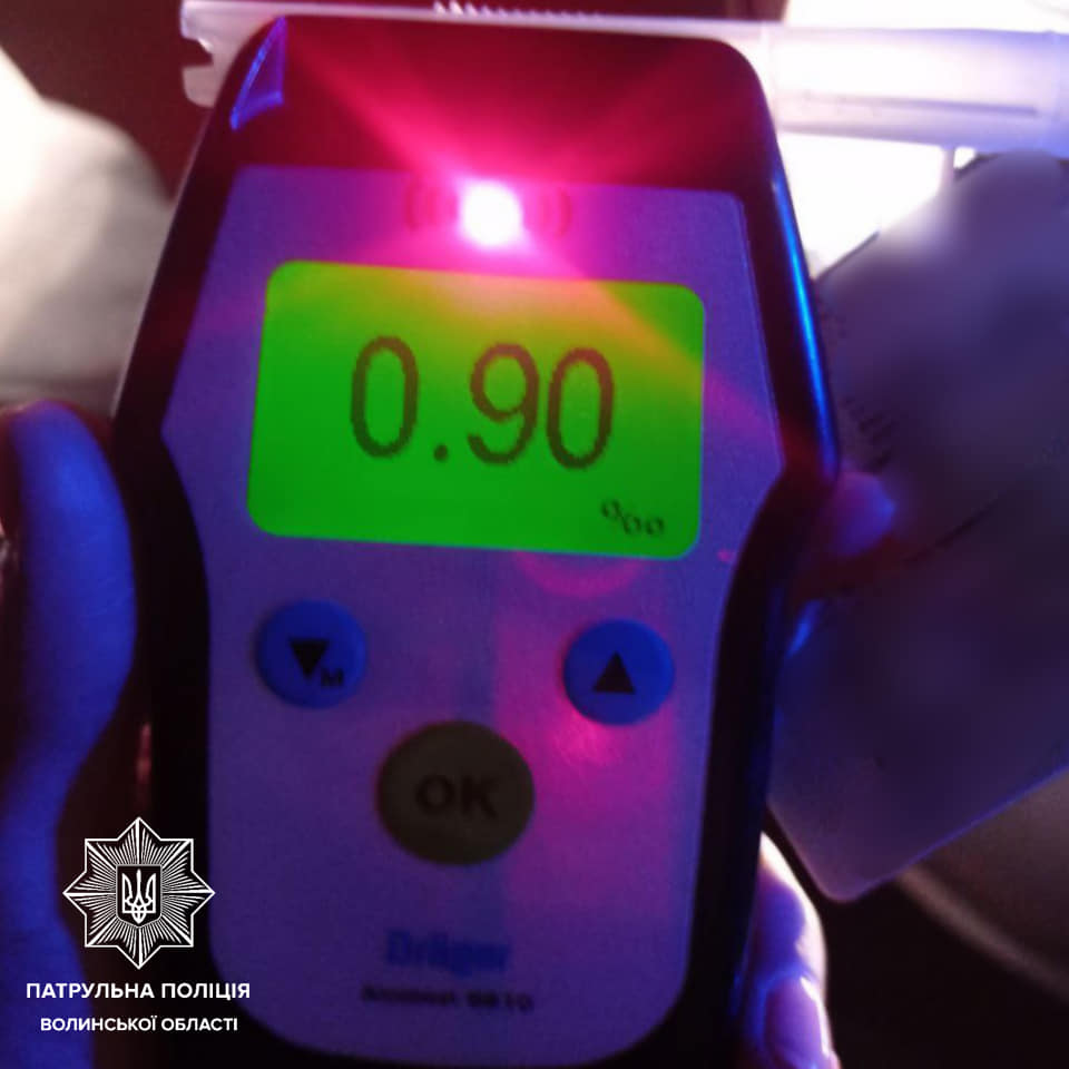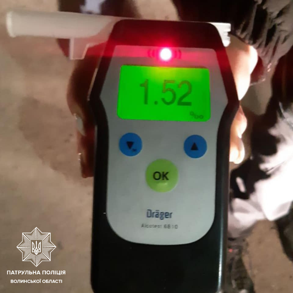 Порушника цієї ночі також виявили патрульні у місті Ковелі. Водій Mercedes-Benz ML63 пройшов огляд на визначення стану сп'яніння на місці події. Результат – 1,65 проміле, що в 8 разів перевищує допустиму норму.