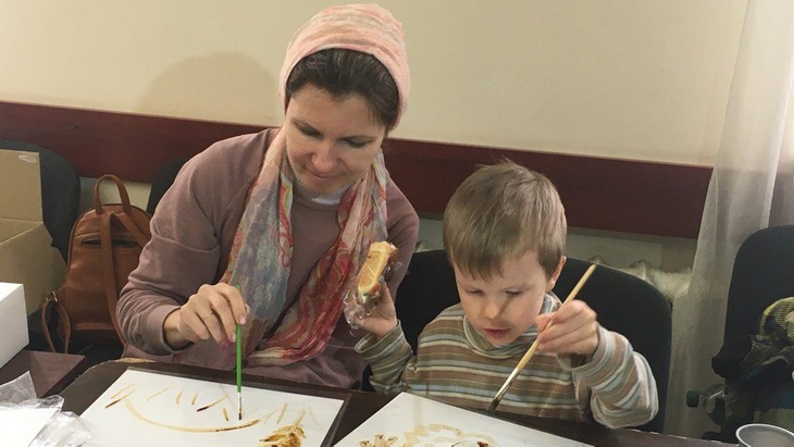 Юлія Балянович — внутрішньопереміщена українка з Києва. На майстер-клас жінка прийшла з двома синами. На занятті з інтуїтивного живопису, — каже, — намалювала дуже символічну картину.