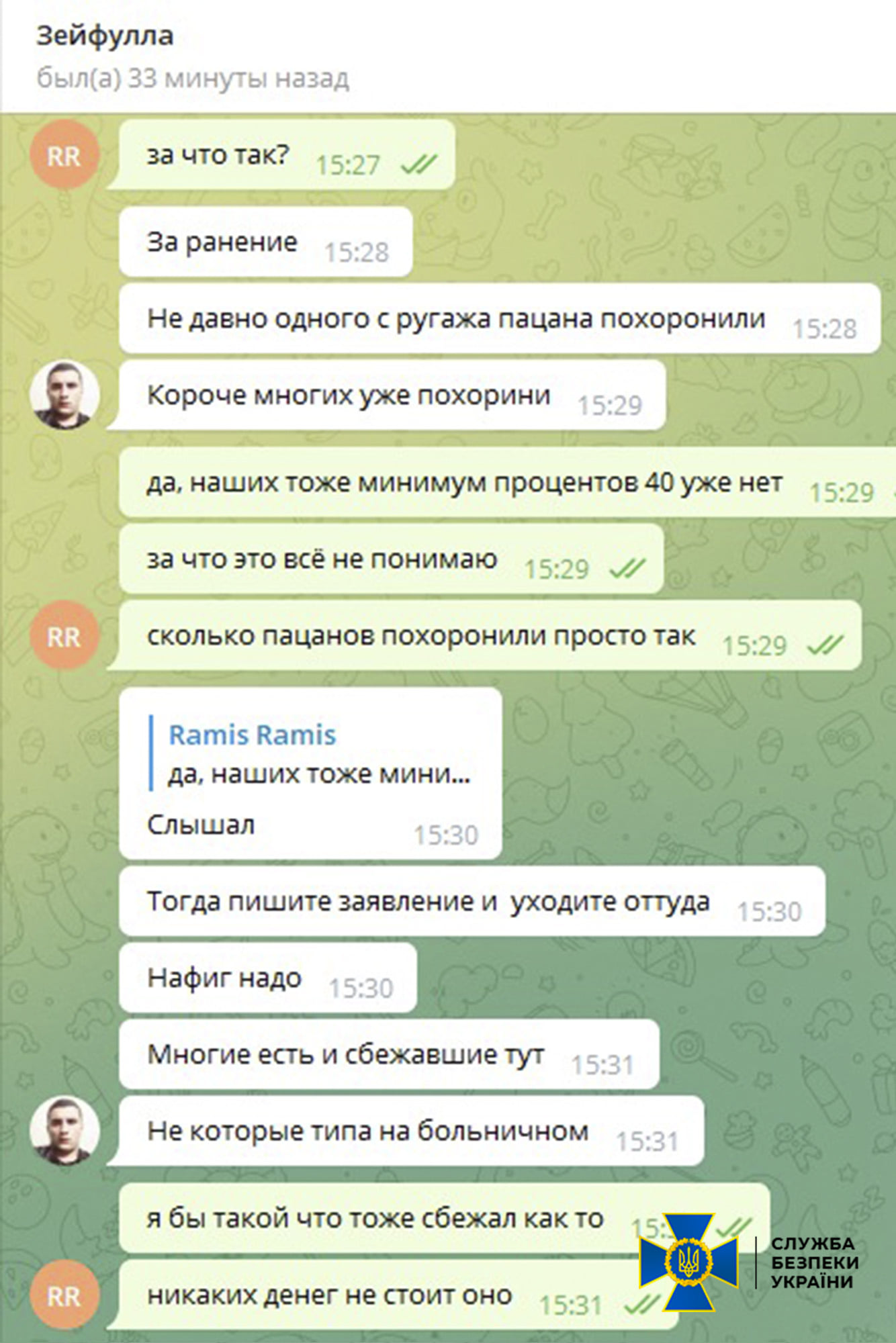 В ході листування окупант повідомляє, що українські військові знищили його підрозділ приблизно на 40%. Загарбник зізнається, що в такій ситуації він задумується над дезертирством і його зовсім не мотивують 3 млн рублів, які російським солдатам нібито видають за поранення.