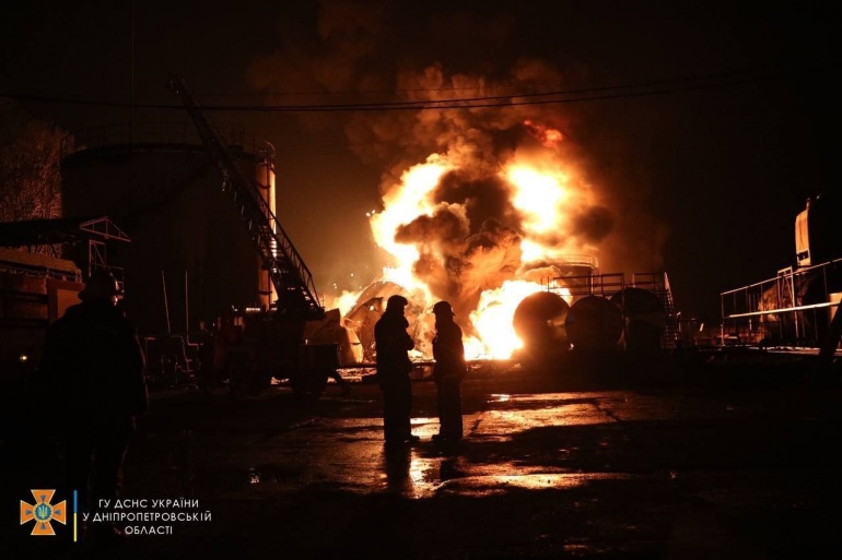 На Дніпропетровщині російські ракети знищили нафтобазу й підпалили завод, пожежу гасять досі.