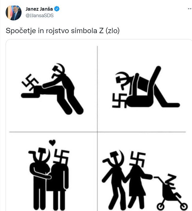 Прем'єр-міністр Словенії Янез Янша у своєму Twitter-акаунті опублікував мем про появу символу «Z», який російська армія використовує під час вторгнення в Україну.