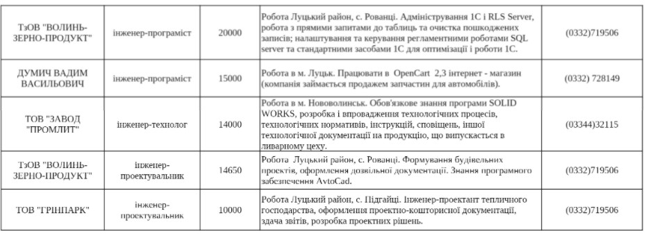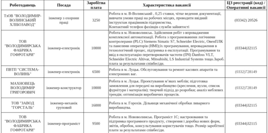 Волинський обласний центр зайнятості надав ГІТу перелік актуальних вакансій на посаду «інженер» із зарплатою понад 10 000 гривень.