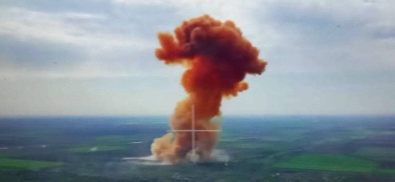 На Миколаївщині окупанти обстріляли ємність із нітроамофоскою (універсальне азотно-фосфорно-калійне добриво), через що в небо піднявся рожевий гриб диму.