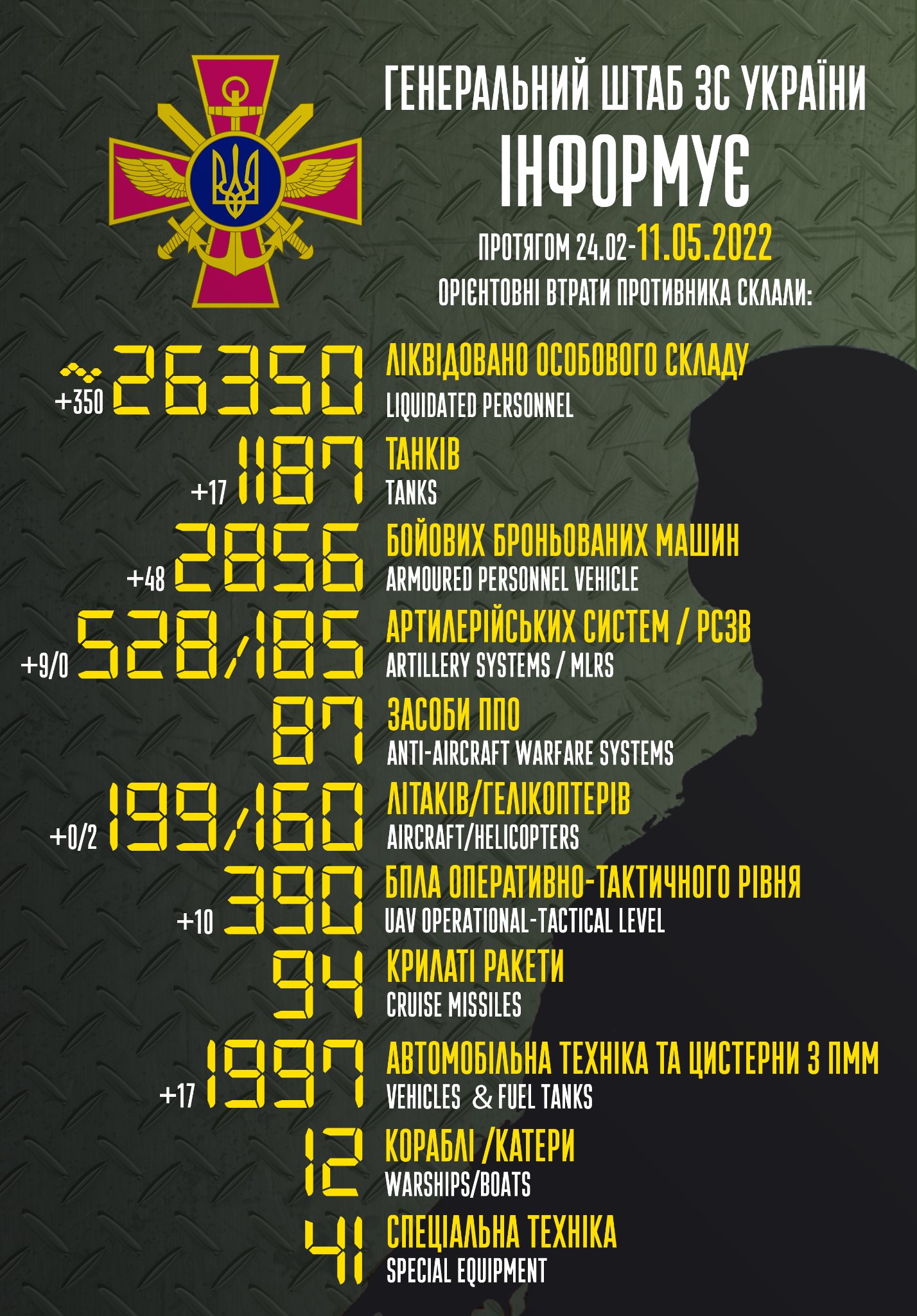 Станом на ранок 11 травня втрати Росії у війні становлять близько 26 350 осіб.