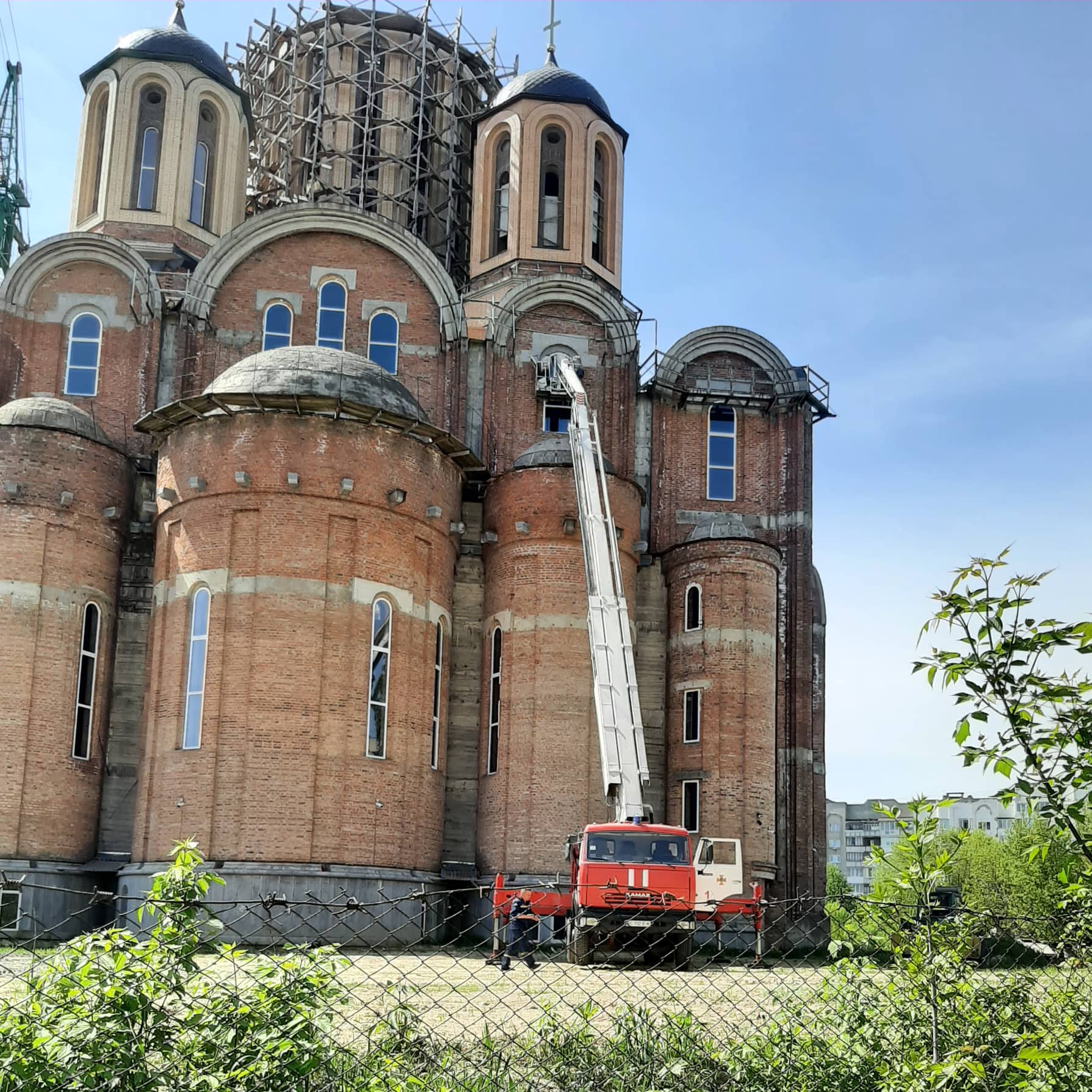У Луцьку в середу, 11 травня, за допомогою спецтехніки ДСНС вставляли вікна у храмі Всіх святих землі Волинської, що належить УПЦ московського патріархату.