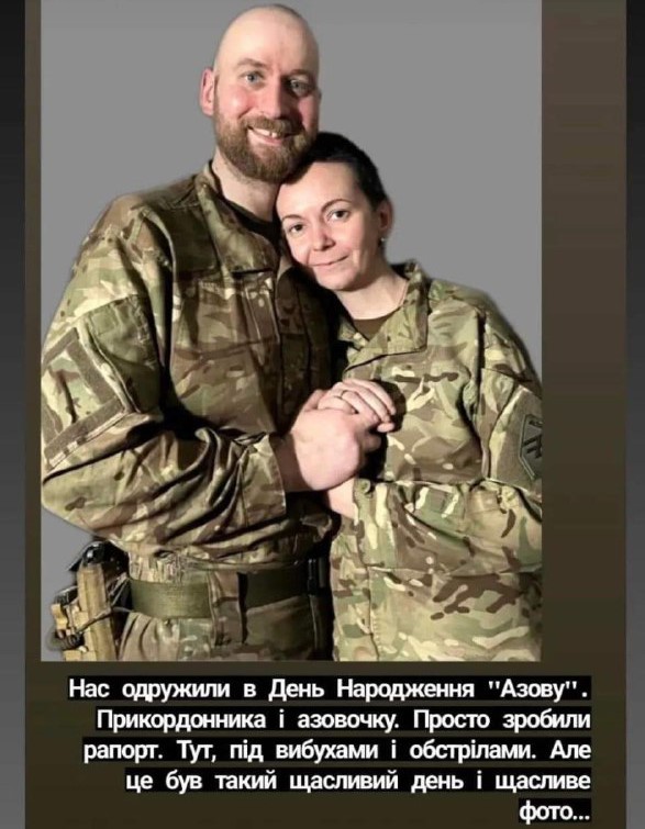 «Нас одружили в день народження «Азову». Прикордонника й азовочку. Просто зробили рапорт. Тут, під вибухами і обстрілами. Але це був такий щасливий день і щасливе фото», – пише дівчина.