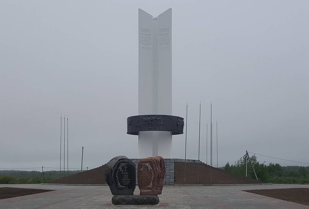 Монумент височіє на пагорбі, на потрійному прикордонному стикові, має три пілони з гербами білоруської РСР, РРФСР, Української РСР, які обвиває бронзове кільце.