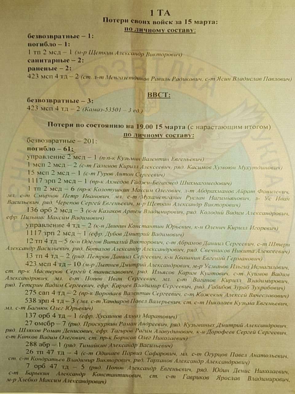 Станом на 15 березня загальні втрати 1 російської танкової армії становили 409 осіб. Українськими воїни ліквідували 61 та поранили 209 окупантів. Лише за перші два тижні війни зникли безвісти 44 російські танкісти та 96 окупантів зі складу цієї армії вирішили зберегти свої життя та здалися в полон.