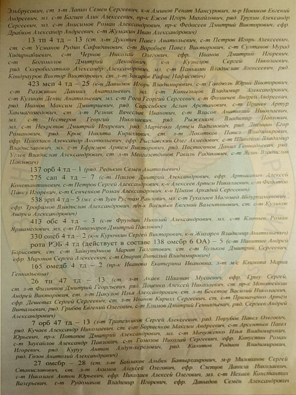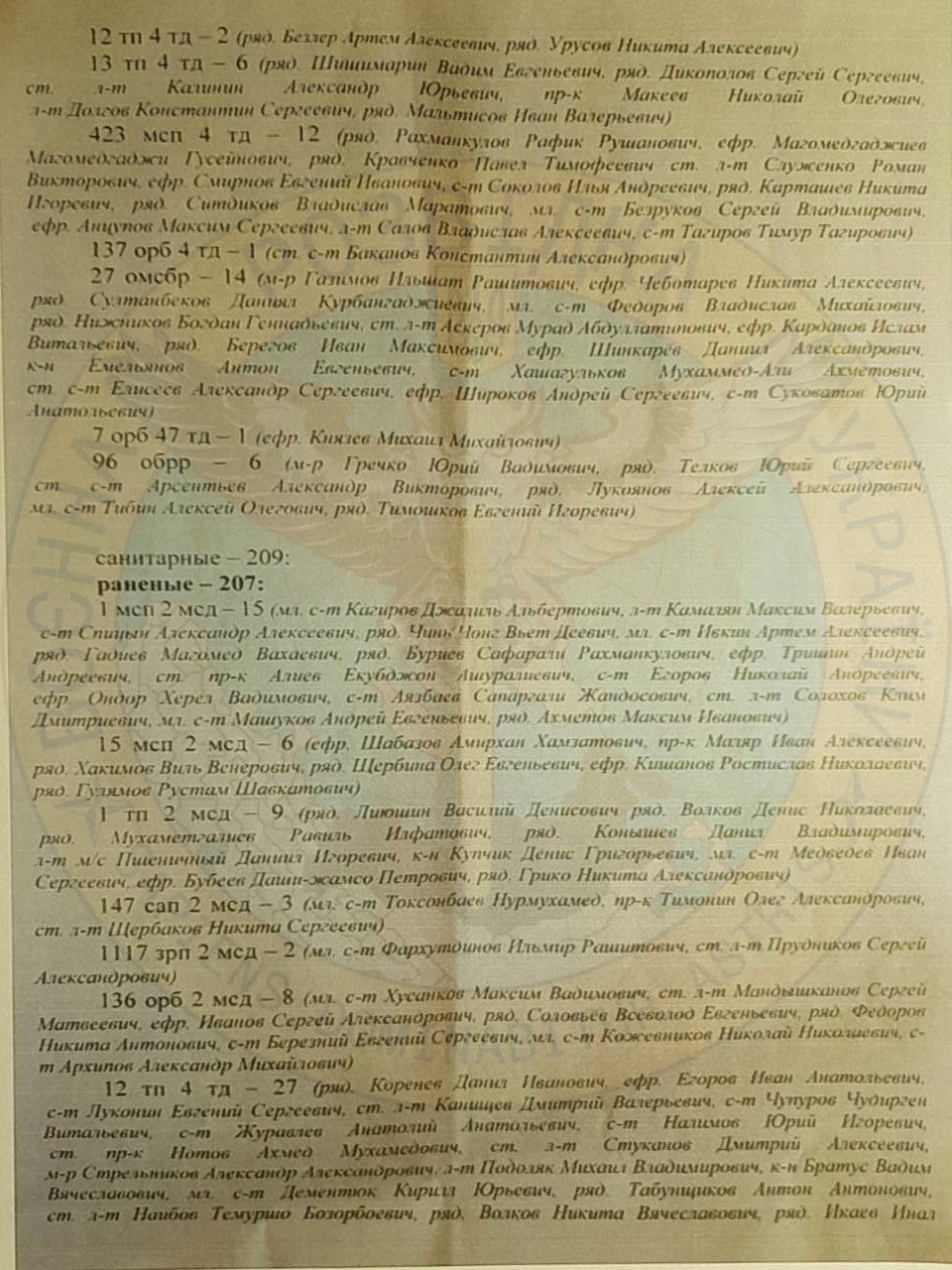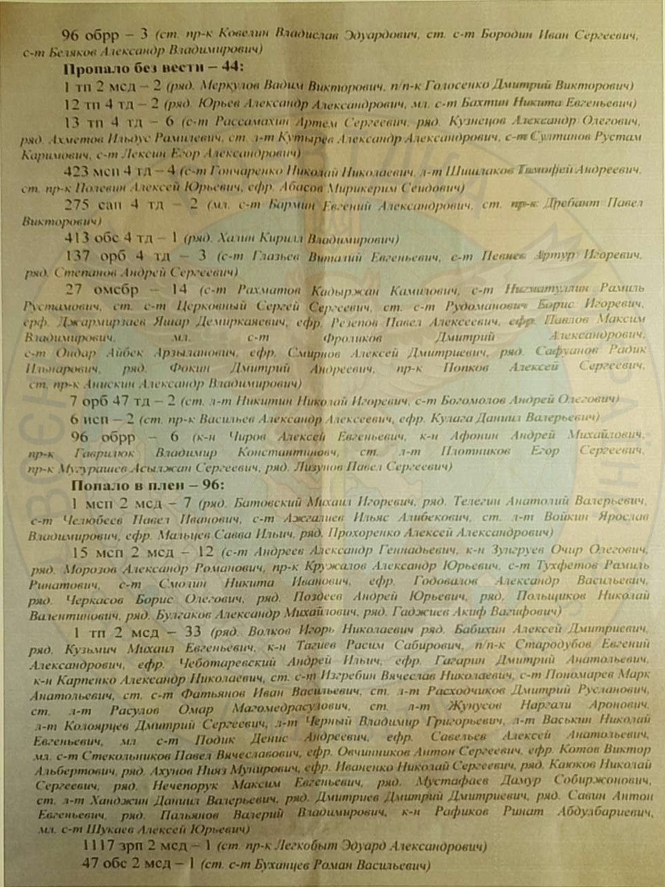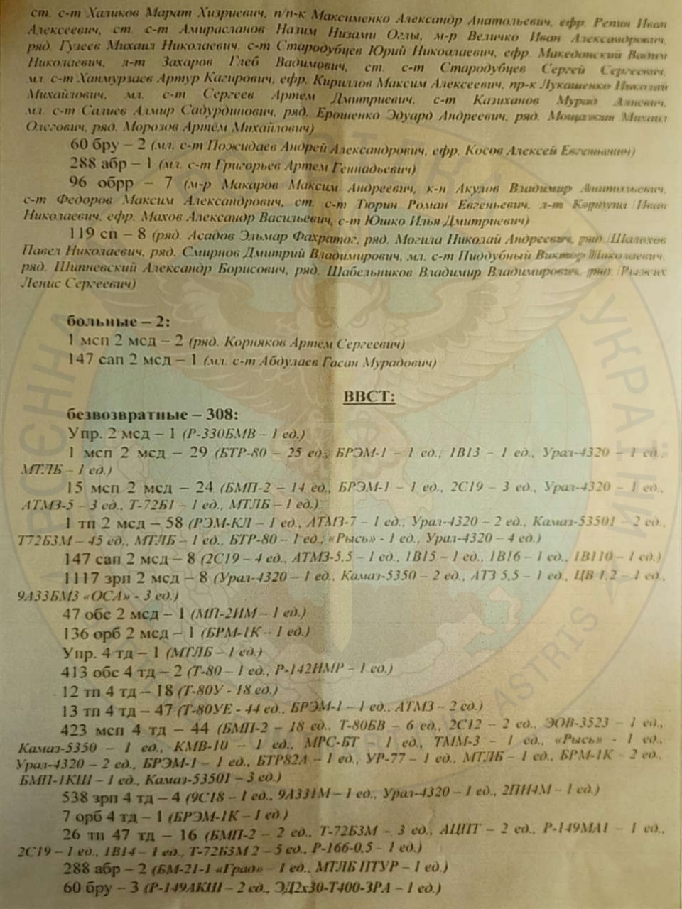 Вивчення та аналіз добутих документів дозволив встановити перелік підрозділів, які беруть участь у військовому вторгненні на територію України, військові звання та прізвища окупантів, які під час ведення бойових дій загинули, пропали безвісти, потрапили в полон або отримали поранення.