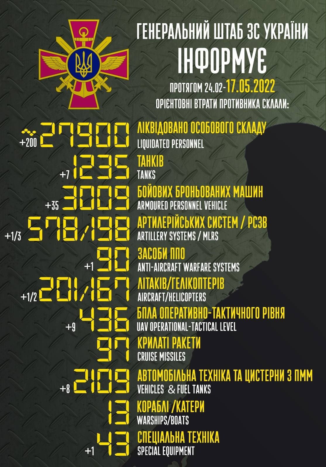Загальні бойові втрати ворога з 24 лютого до 17 травня орієнтовно сягнули (в дужках – за минулу добу):