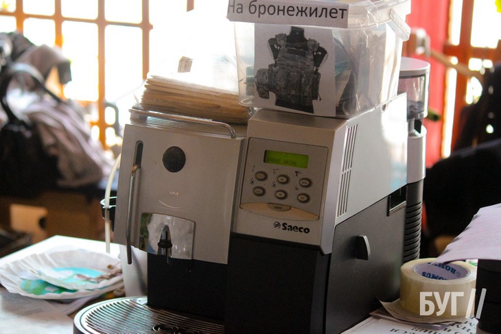 У приміщенні також стоїть кавовий апарат. Кожен охочий може випити гарячого напою, а будь-яку суму – віддати на збір бронежилетів для військових.