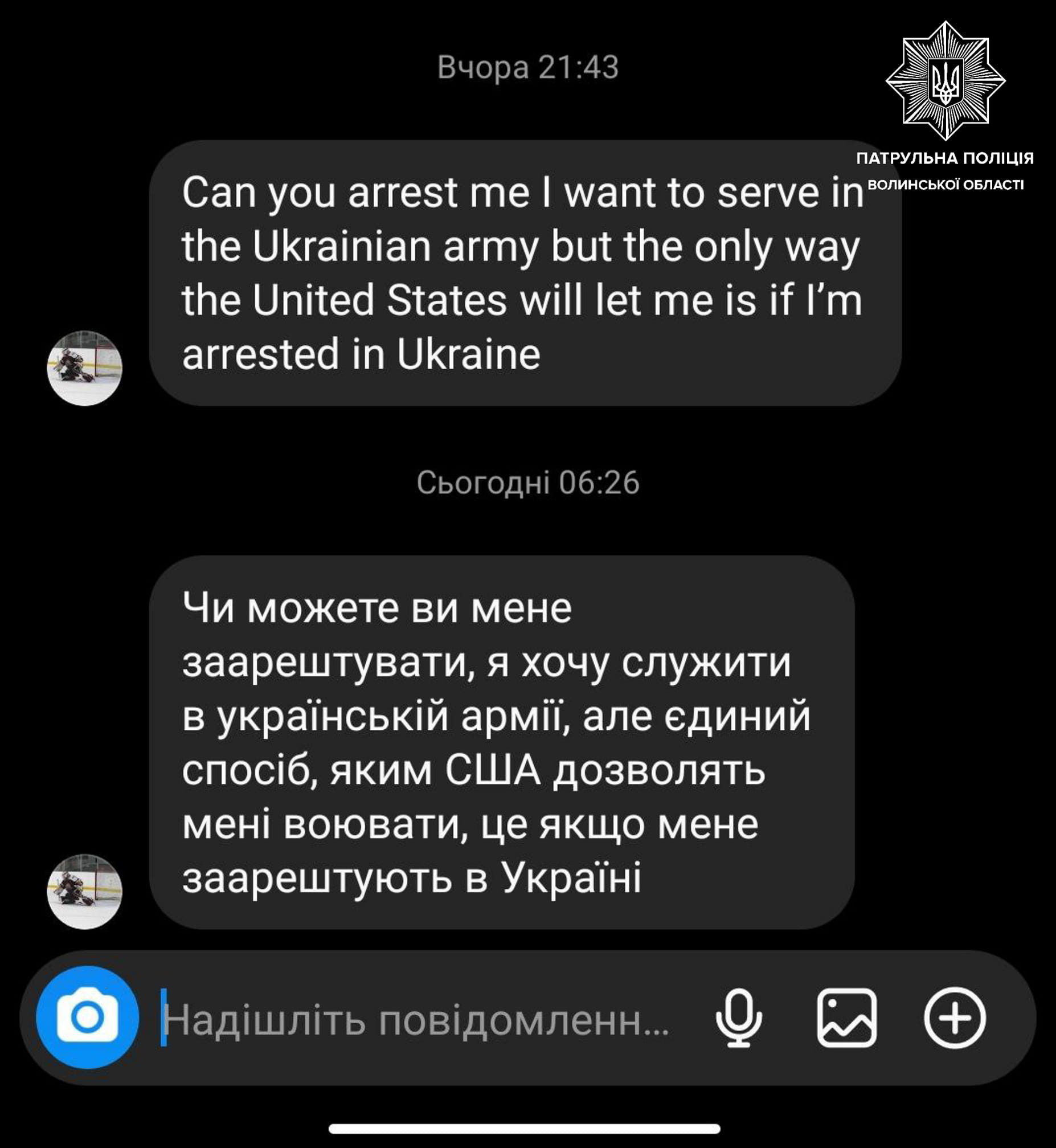 Вони опублікували повідомлення від одного американця, який просить патрульну допомогти Волині йому потрапити в Україну, аби воювати за нас.