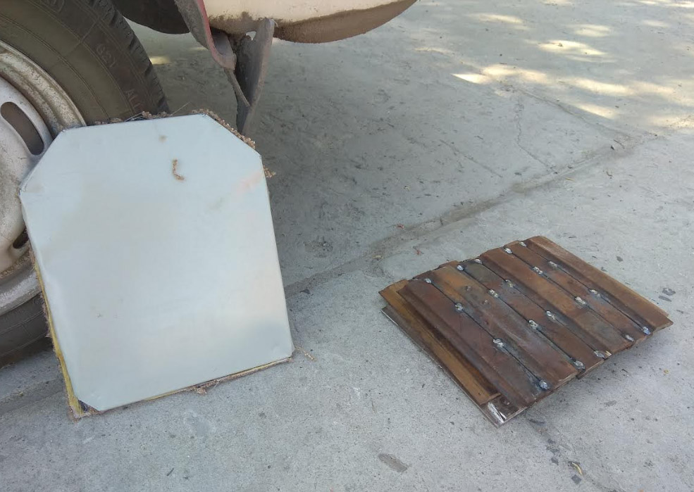 Чоловік демонструє порізані ресори та зварені у заготовку для захисної плити. Каже, потім це все ще доведуть до ладу. У першу чергу відстріляють, тобто перевірять на міцність, потім обтягнуть з одного боку бляхою, з іншого — войлоком.
