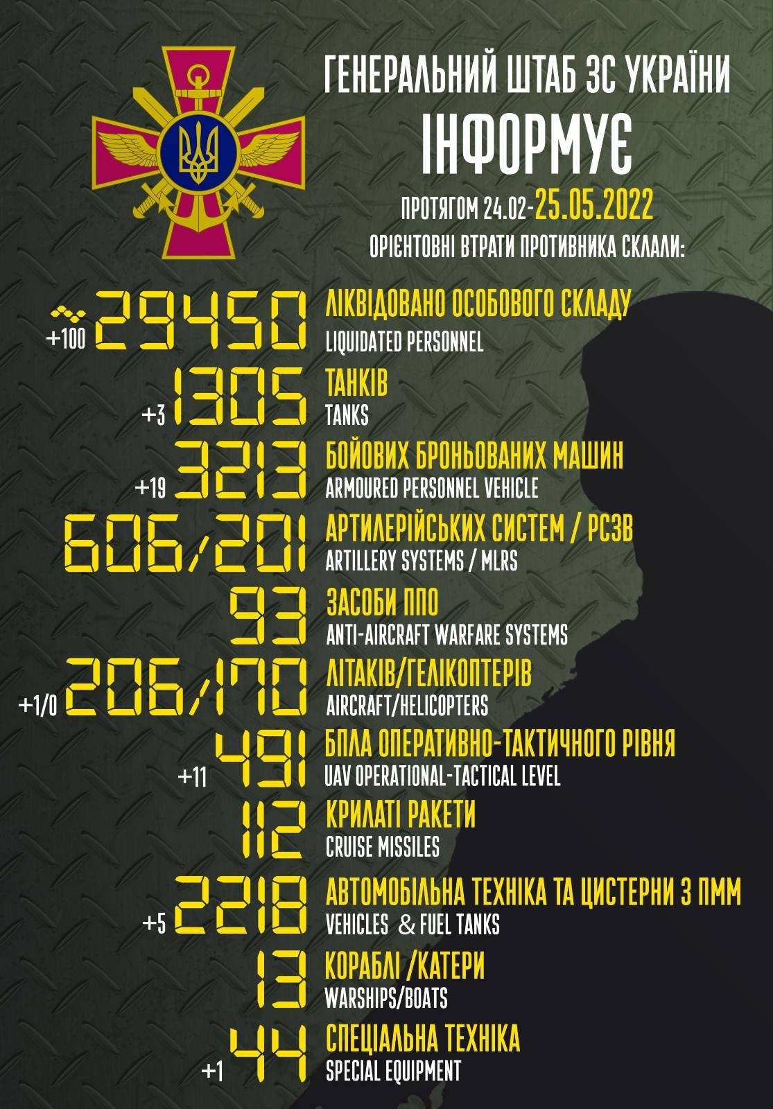 Загальні бойові втрати противника з 24.02 по 25.05 орієнтовно склали: