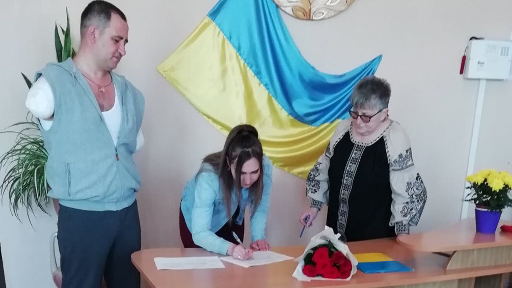 Однак місцеві волонтери, які опікуються військовими в госпіталі, підготували для молодят свято – накрили фуршетний стіл, прикрасили приміщення, привітали. Одне слово, постаралися, аби подія була урочистою й пам’ятною. Усіх присутніх до сліз вразив момент, коли Таня одягла на шию чоловіку ланцюжок з обручкою, а він – губами каблучку на її безіменний палець.