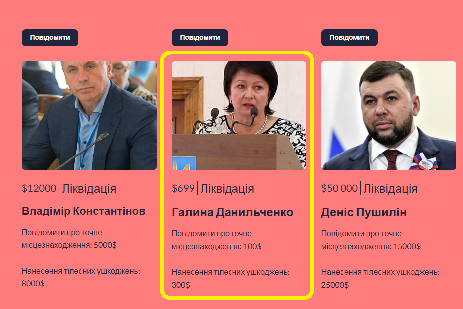 А сайт RZ Money пропонує усім бажаючим гроші за ліквідацію мелітопольської колаборантки. Життя Галини Данильченко невідомі автори сайту оцінили у $699.