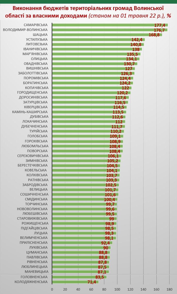 Так, Самарівська ТГ виконала бюджет за власними доходами за 4 місяці на 177,4%, Володимир-Волинська – на 176,7%, Шацька – на 168,8%.