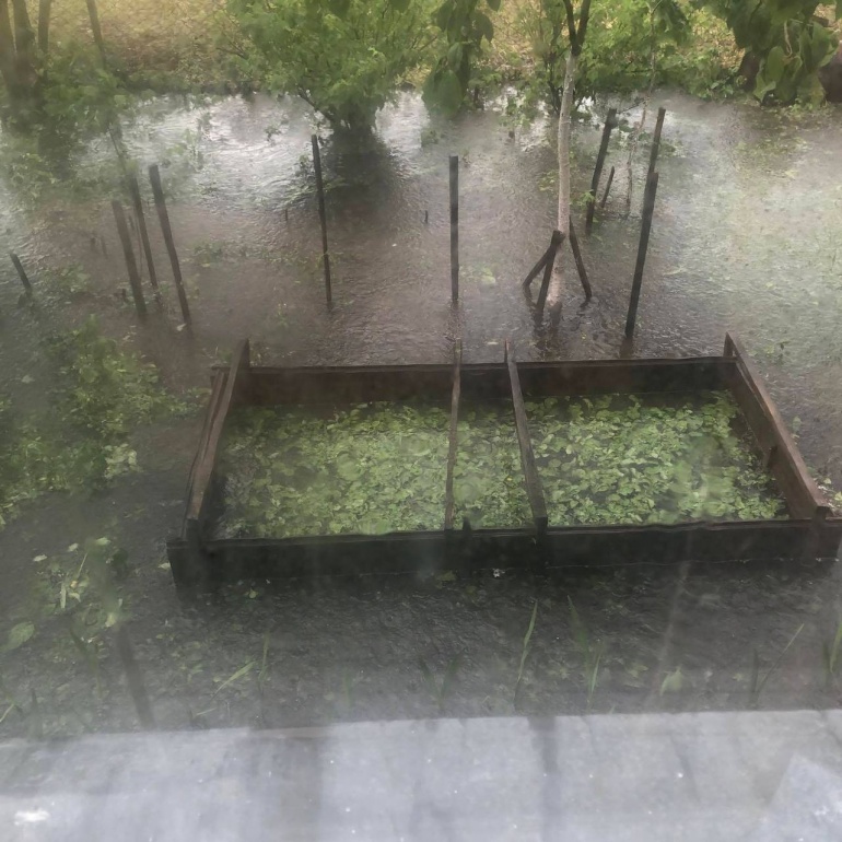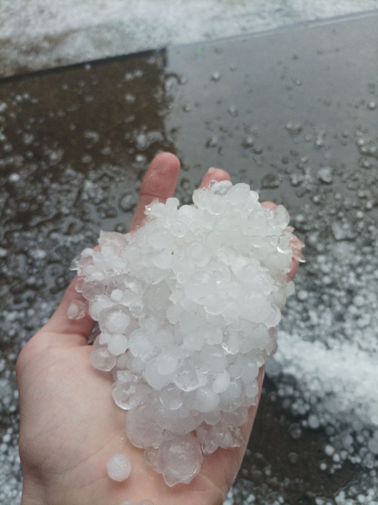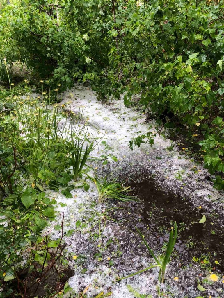 Подекуди дощ йшов із сильним градом, який утворив суцільний покрив на землі.