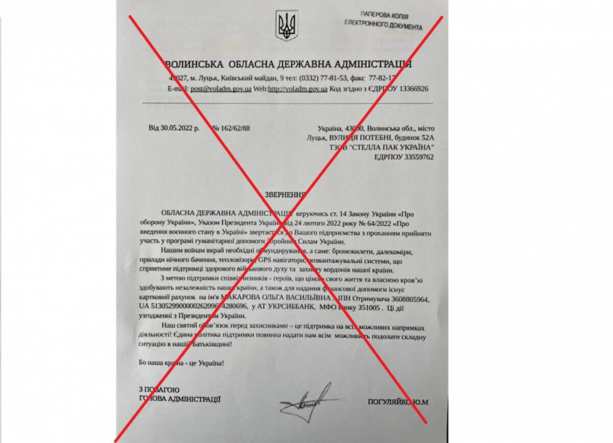 Стало відомо про листи щодо збору коштів на Збройні сили України, які надходять до підприємців Волині нібито від імені Волинської обласної державної адміністрації. Будьте обережні! Це шахраї. Волинська обласна державна адміністрація таких листів не надсилала, – зазначають в уряді.