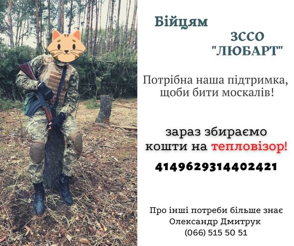 ОЗСП "Любарт" отримав завдання та боронить Україну. Їм треба наша допомога. Терміново потрібно зібрати кошти на тепловізор. В ідеалі потрібен ще квадрокоптер та позашляховик.