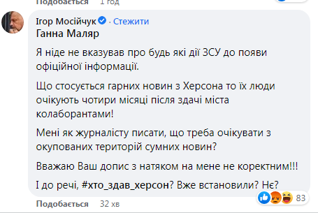 Заодно Мосійчук запитав Маляр, чи вже встановили, хто здав Херсон.