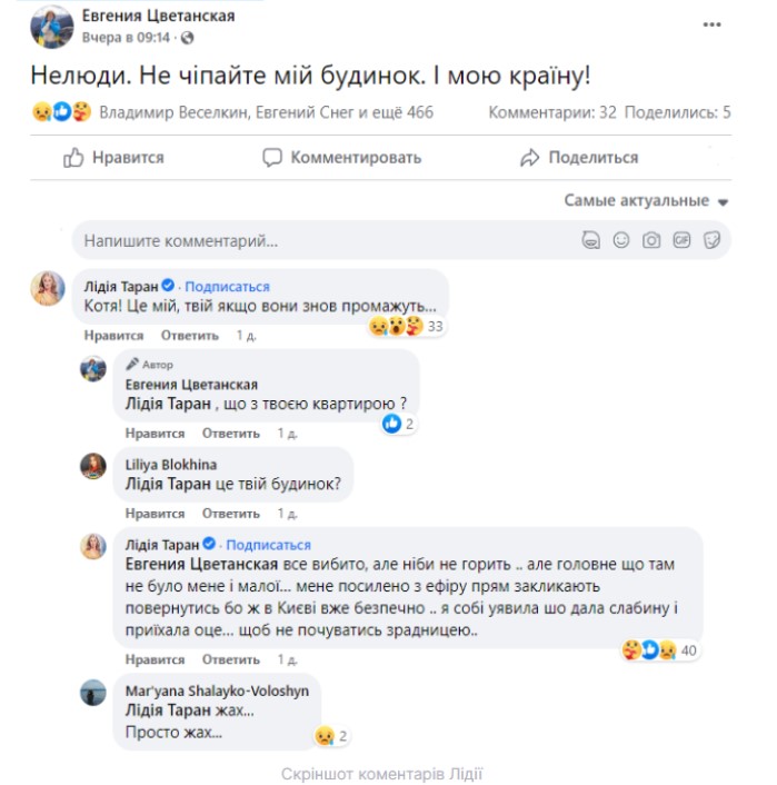У відповідь Таран написала, що в її будинок прилетіла ракета.