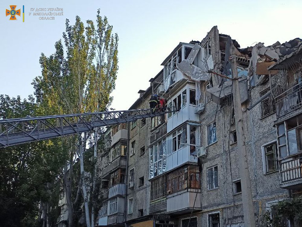 В результаті влучання ворожого боєприпасу в п'ятиповерховий житловий будинок в одному з районів Миколаєва зруйновано квартири в одному під'їзді з третього по п'ятий поверх, де також виникла пожежа.