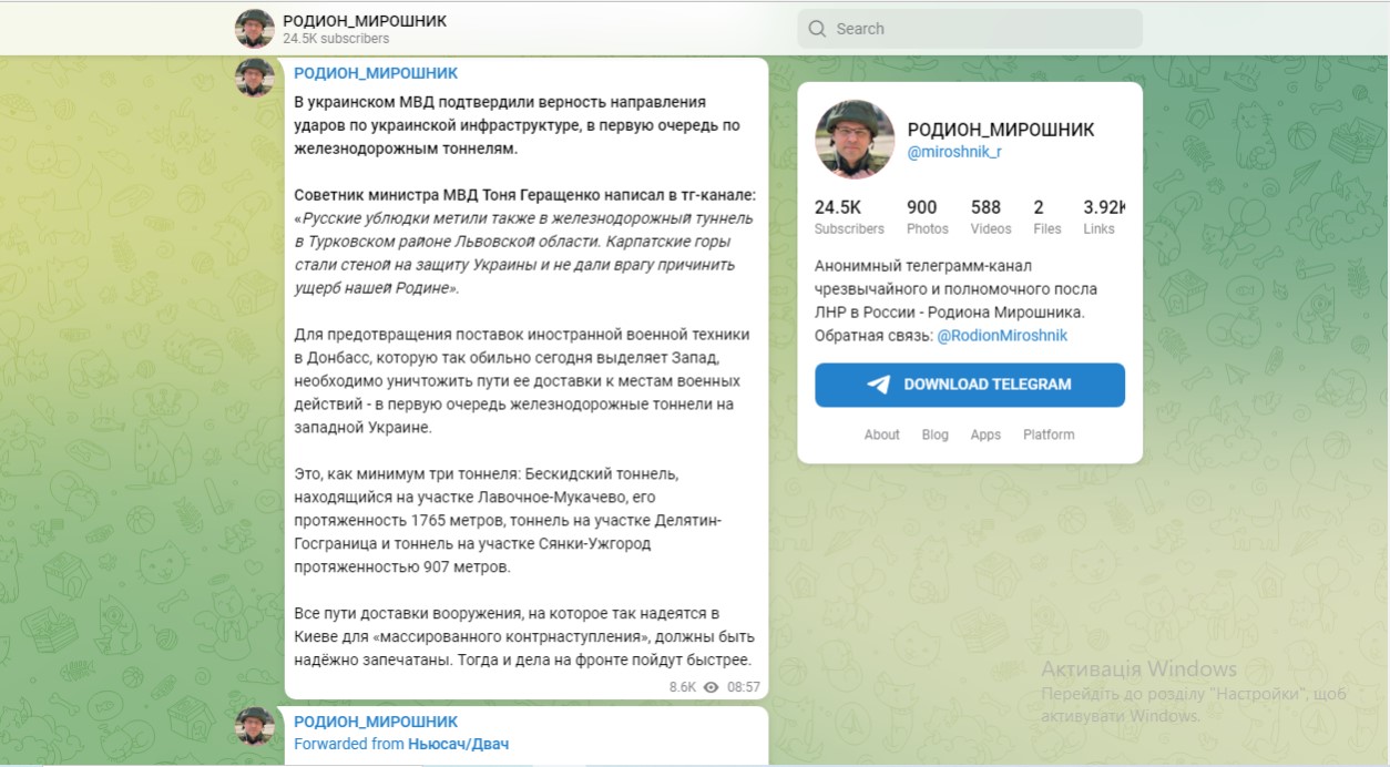 Так званий "посол ЛНР" у рф Родіон Мірошник заявив, що "для запобігання постачанню іноземної військової техніки на Донбас, яку так рясно сьогодні виділяє Захід, необхідно знищити шляхи її доставки до місць воєнних дій – насамперед залізничні тунелі на західній Україні".