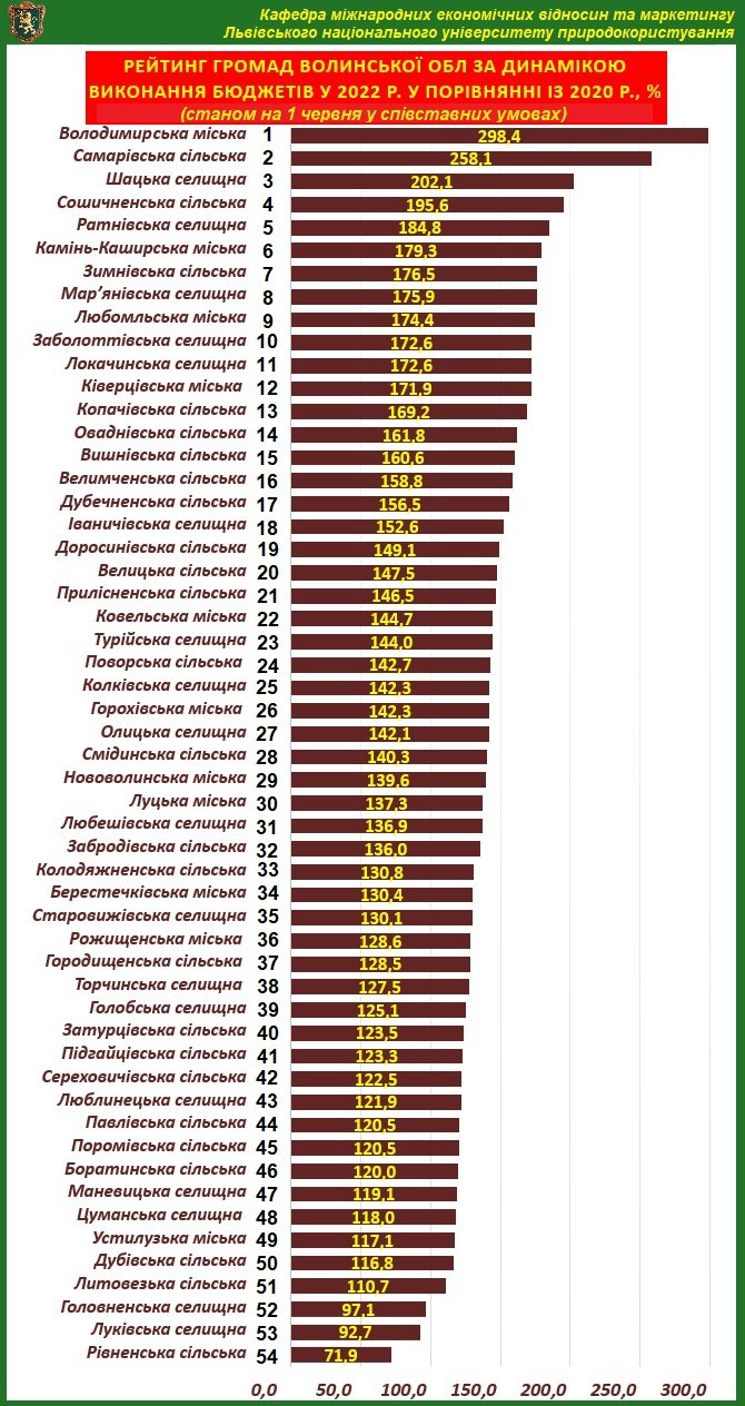 Ковельська міська громада розташувалася на 22-му місці (144,7%), Нововолинська – на 29-му (139,6), Луцька – на 30-му (137,3).