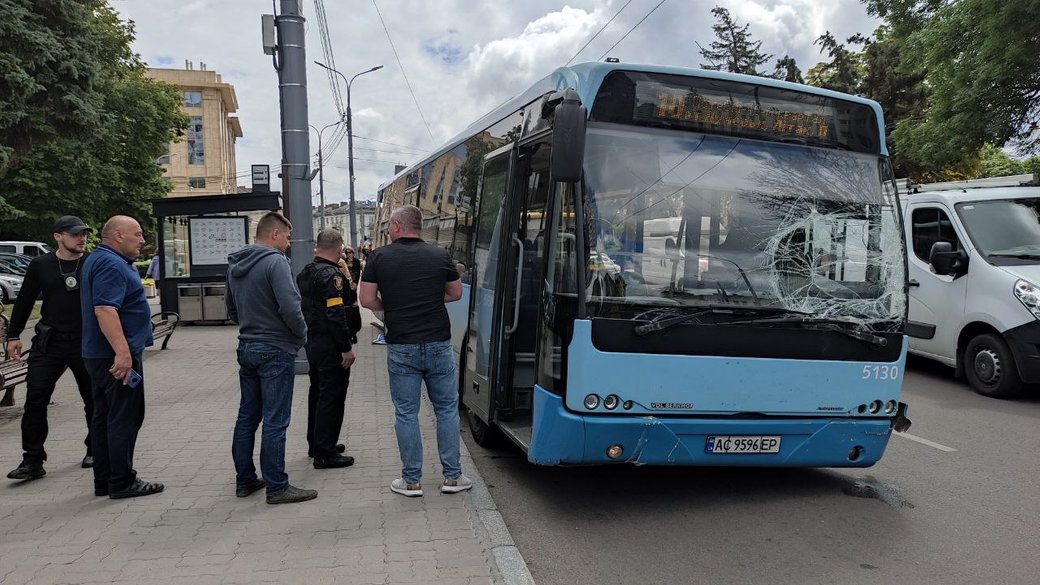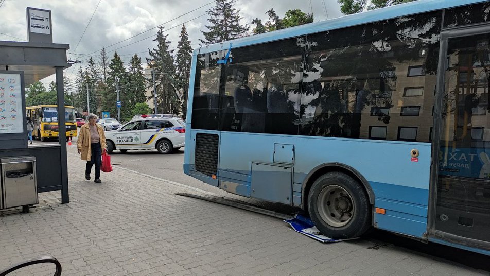 Водій автобуса №10 Василь Ротмислович розповів, що його транспорт виїхав на тротуар через зіткнення з іншим автобусом.