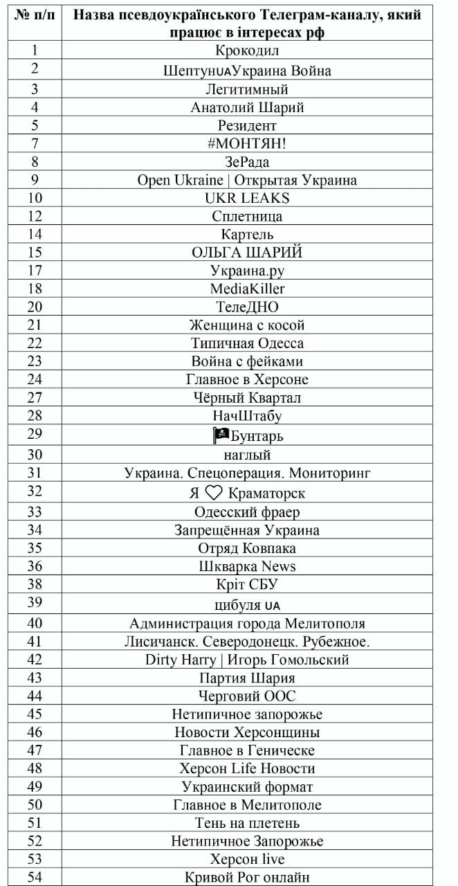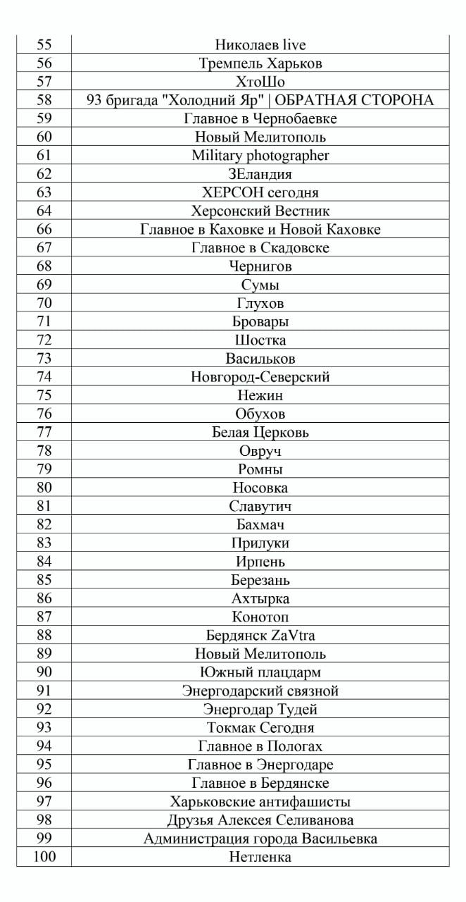 Йдеться про канали Легитимный, Сплетница, Картель, Резидент, Наблюдатель, MediaPost, «Женщина с косой» та інші телеграм-канали, список яких час від часу доповнюється.