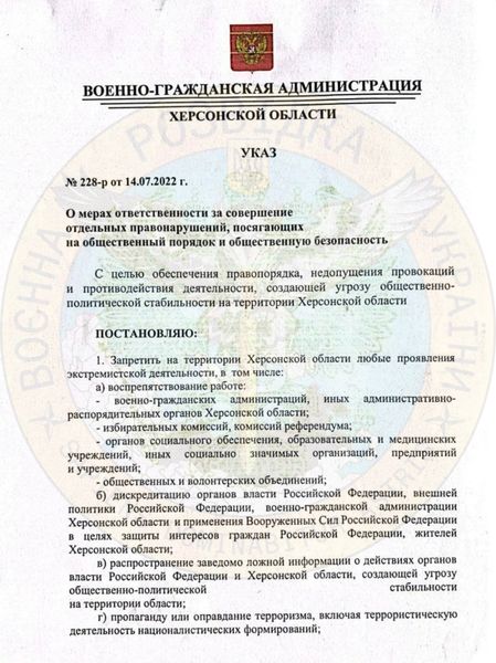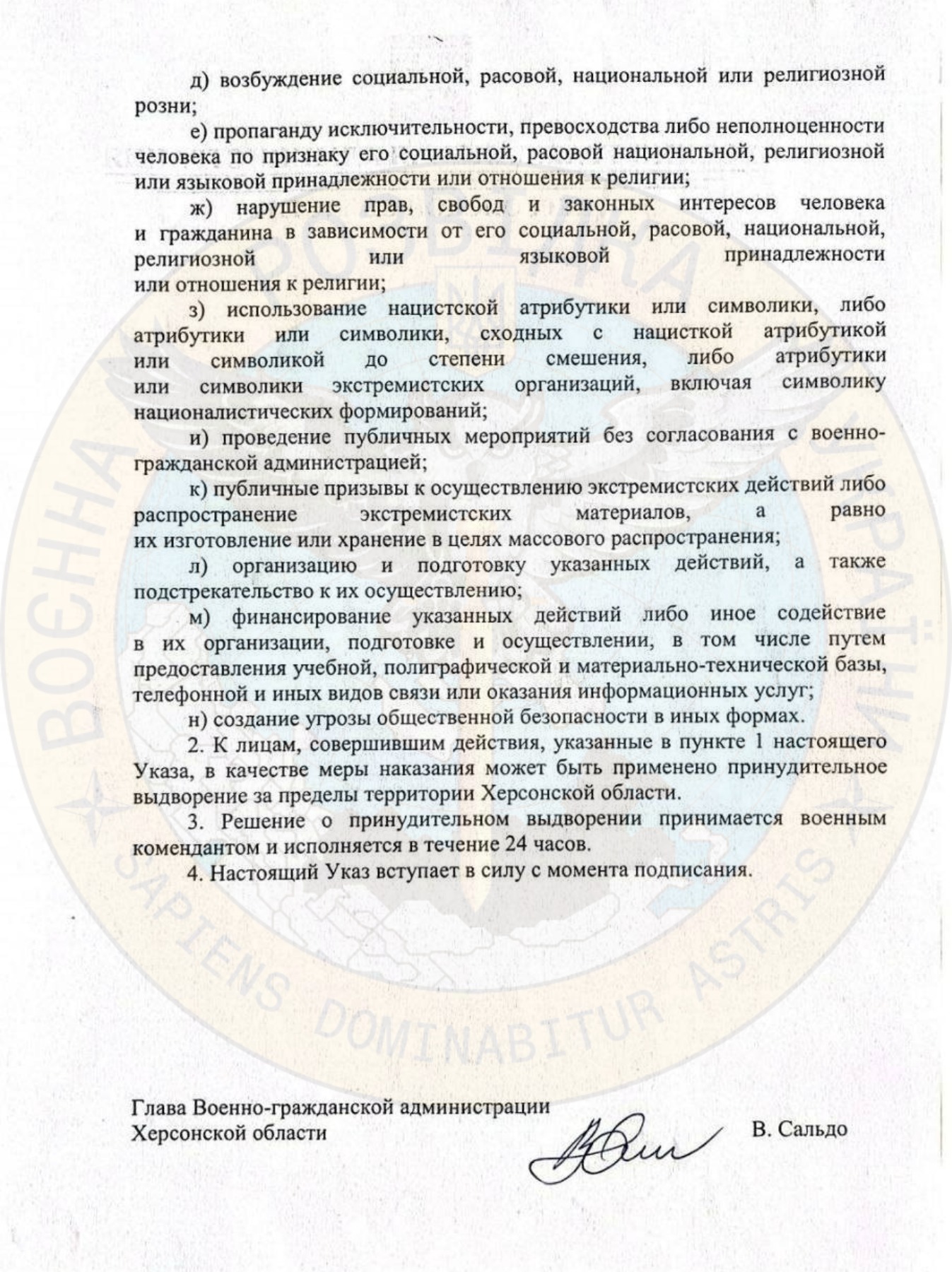 Окупаційні адміністрації у тимчасово окупованих районах Херсонської області посилюють поліцейсько-адміністративний режим. Зокрема, видано наказ так званого голови «воєнно-цивільної адміністрації Херсонської області» колаборанта Володимира Сальдо «Про заходи відповідальності за здійснення окремих правопорушень, що зазіхають на громадський порядок і громадську безпеку».