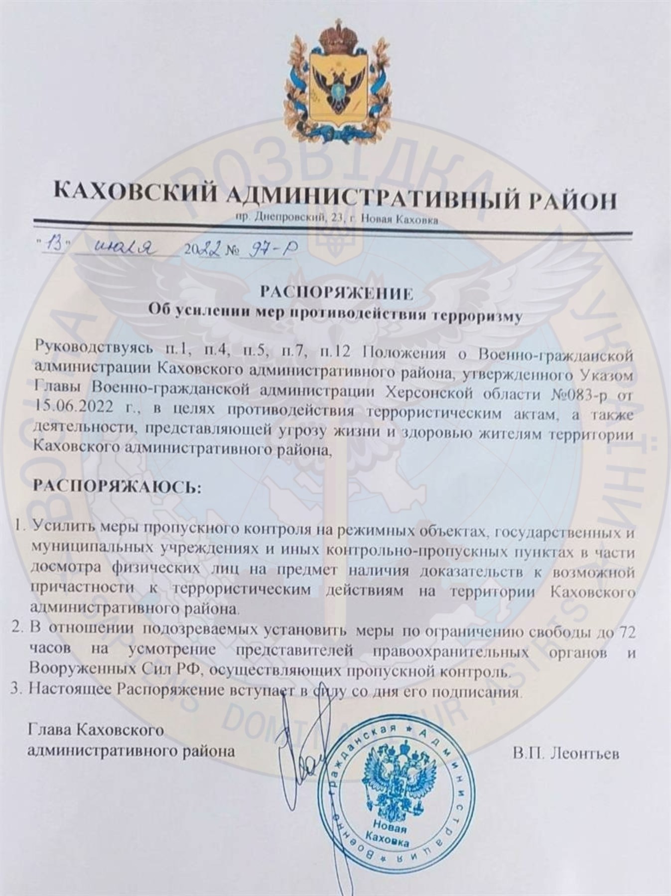 Також розпорядженням «голови Каховської вца» Володимира Лєонтьєва посилюється пропускний контроль на території Каховського району. Надано дозвіл на обшуки, затримання та обмеження волі, які можуть проводитись на розсуд окупантів.