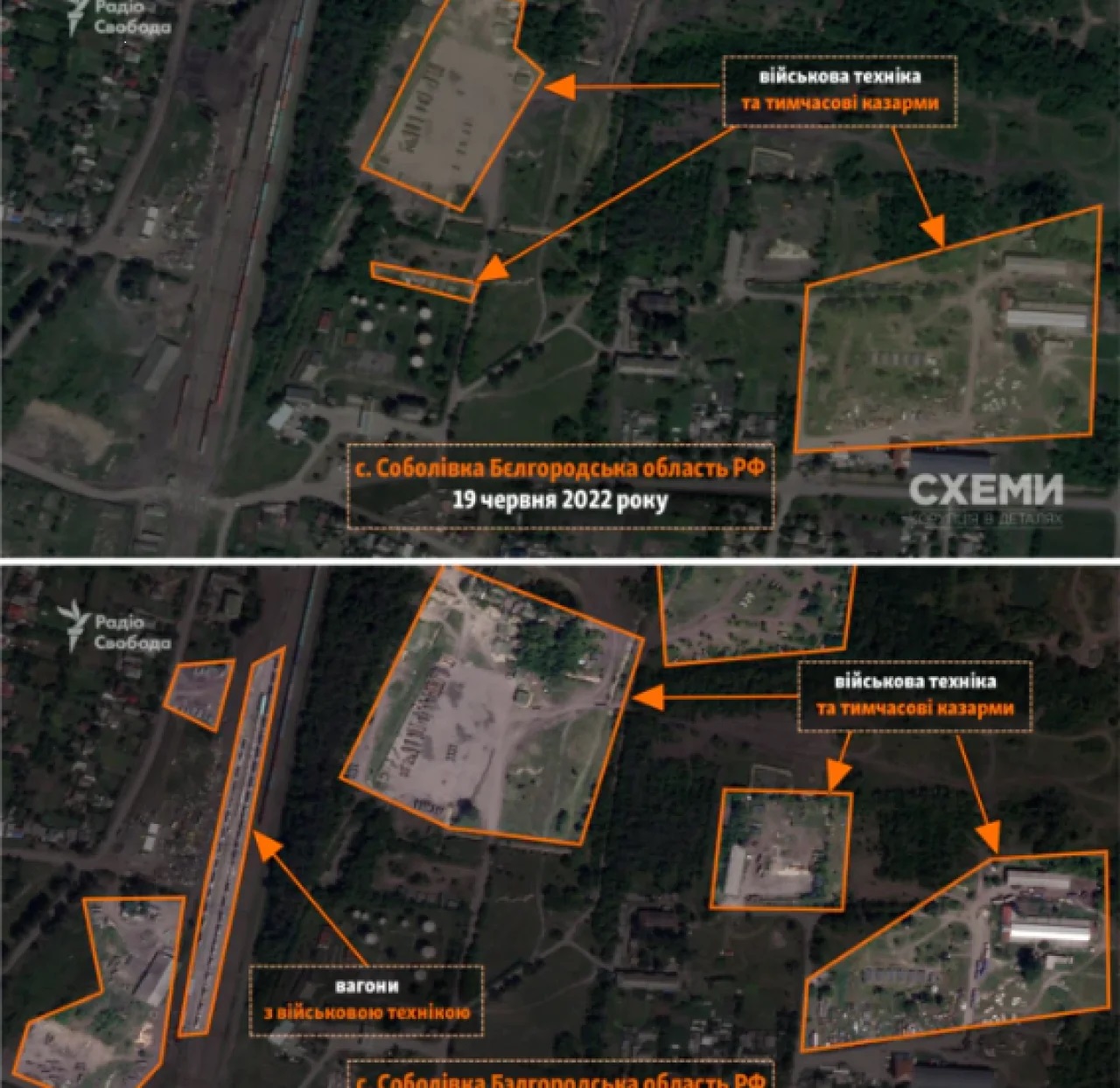 У розпорядженні журналістів опинилися супутникові знімки, на яких видно, що частину техніки транспортують залізницею та звозять її до села Соболівка Бєлгородської області рф.
