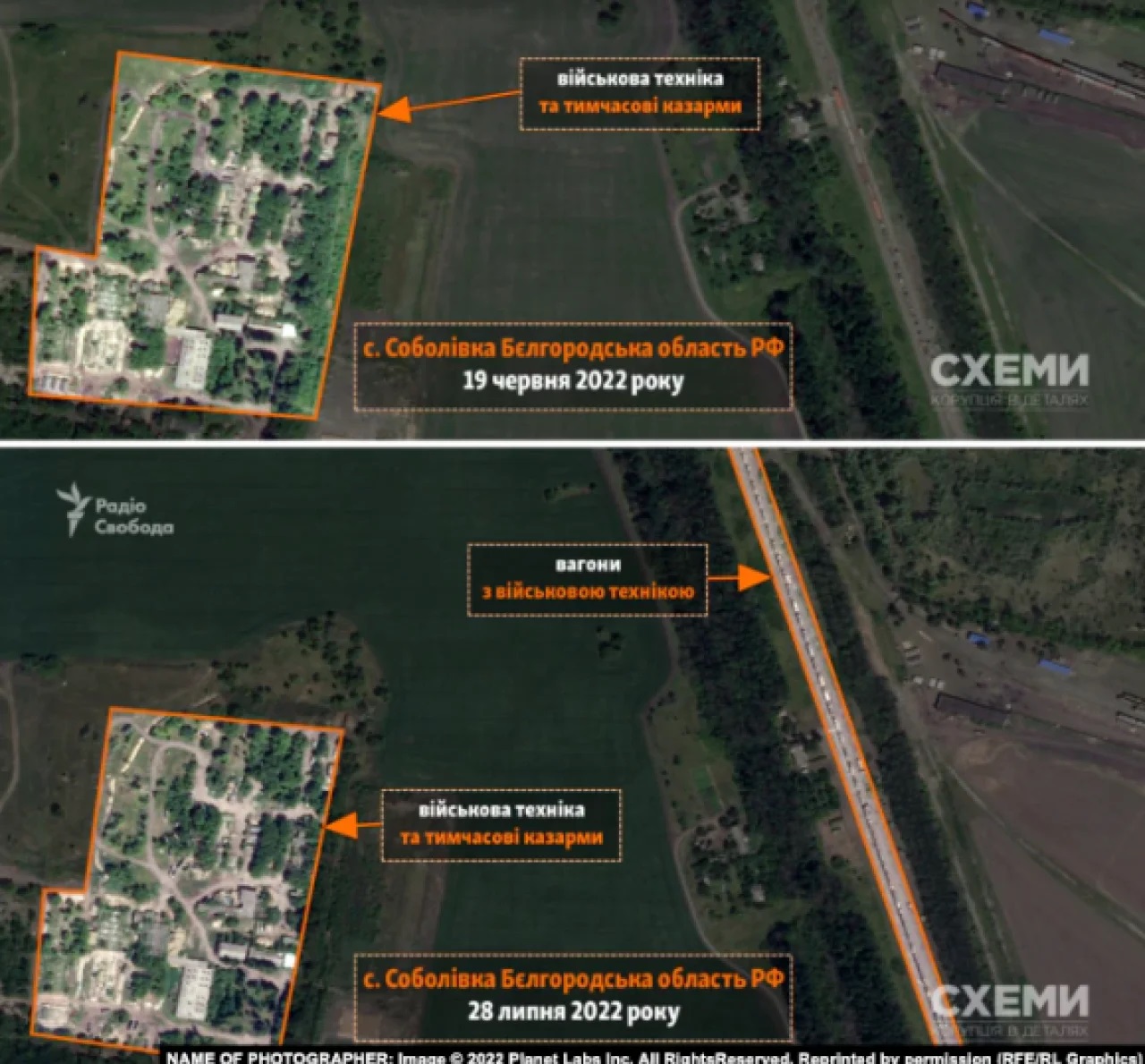 28 липня супутник зафіксував у селі Соболівка збільшення кількості військової техніки та особового складу російської армії порівняно зі знімком із космосу цієї місцевості за 19 червня.