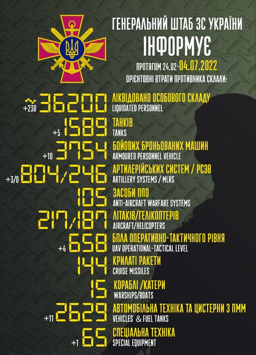 Загальні бойові втрати противника з 24 лютого до 4 липня орієнтовно сягнули (в дужках – за минулу добу):
