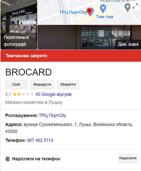 Якщо ж знайти магазин у Картах Google, то там зазначається, що він закритий тимчасово.
