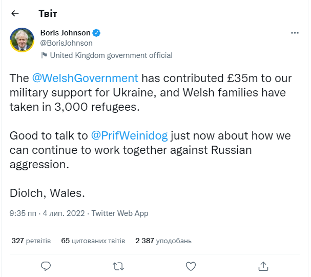 "Уряд Вельсу виділив 35 мільйонів на військову підтримку Україні, а валлійські сім'ї прийняли 3000 біженців" - йдеться у повідомленні.