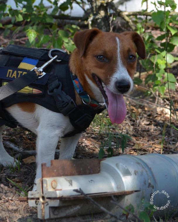 Пес-піротехнік Патрон продовжує активно працювати і шукати різні вибухонебезпечні предмети, щоб його колеги їх знешкодили і убезпечили життя людей навколо.
