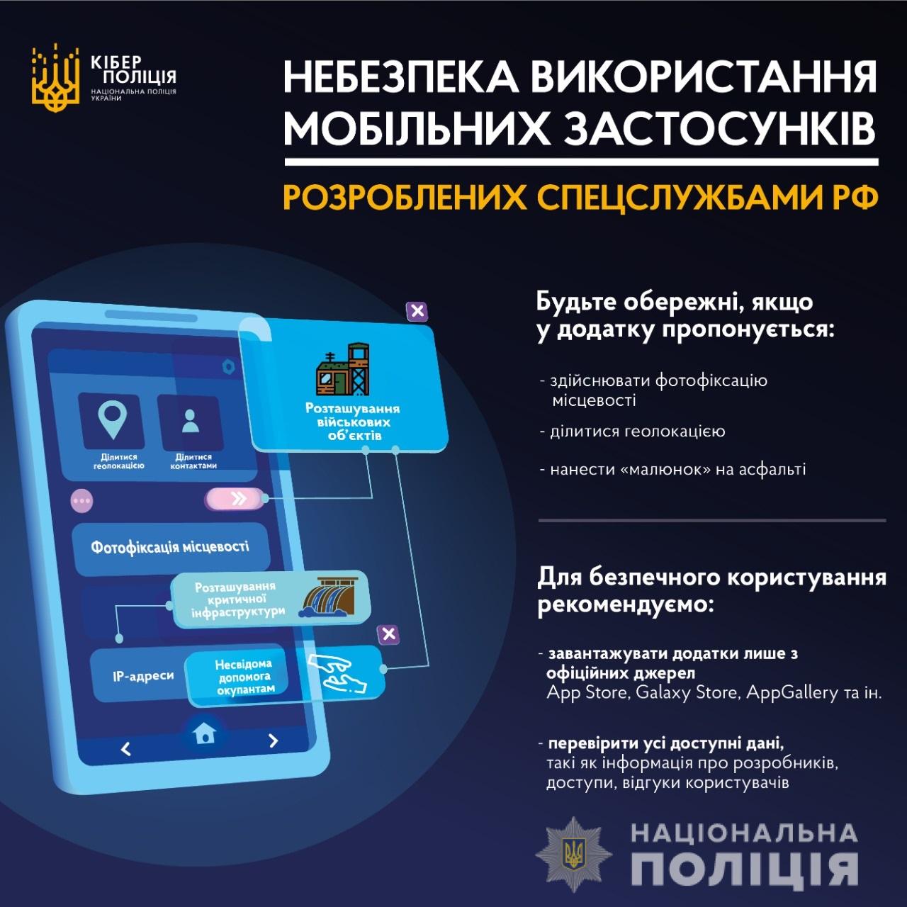 Кіберполіція попереджає про небезпеку використання мобільних застосунків, розроблених спецслужбами російської федерації.