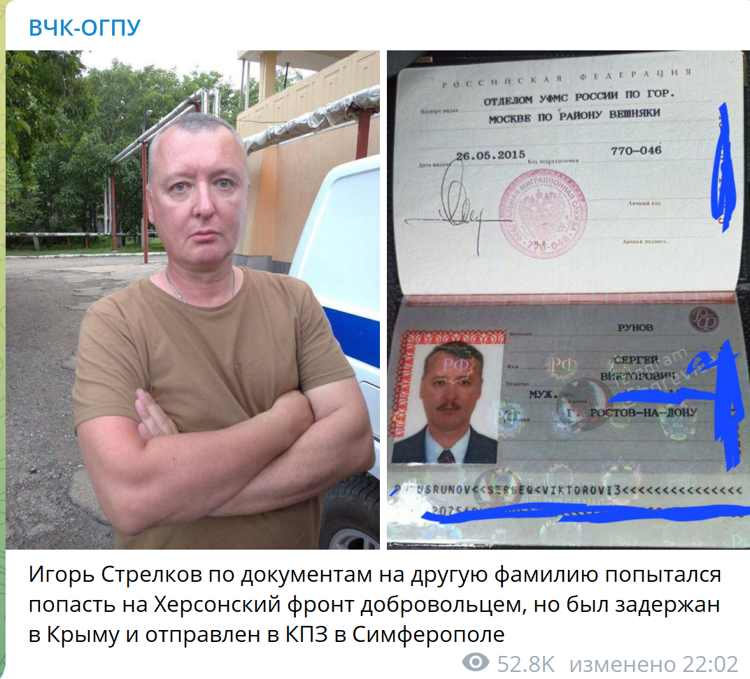 Гіркін намагався потрапити на «херсонський фронт» за підробленим паспортом на ім'я Сергія Вікторовича Рунова, який використав під час роботи у спецслужбах. Втім, його впізнали та відправили до Сімферополя, де відкрили на нього кримінальне провадження за підробку документів.
