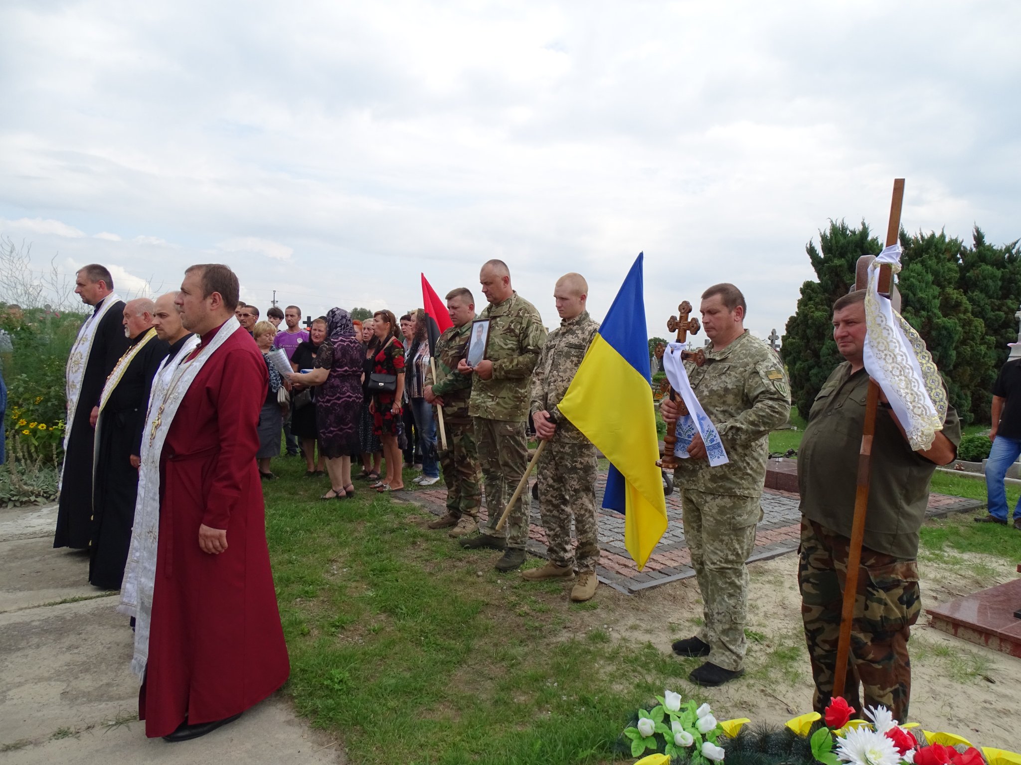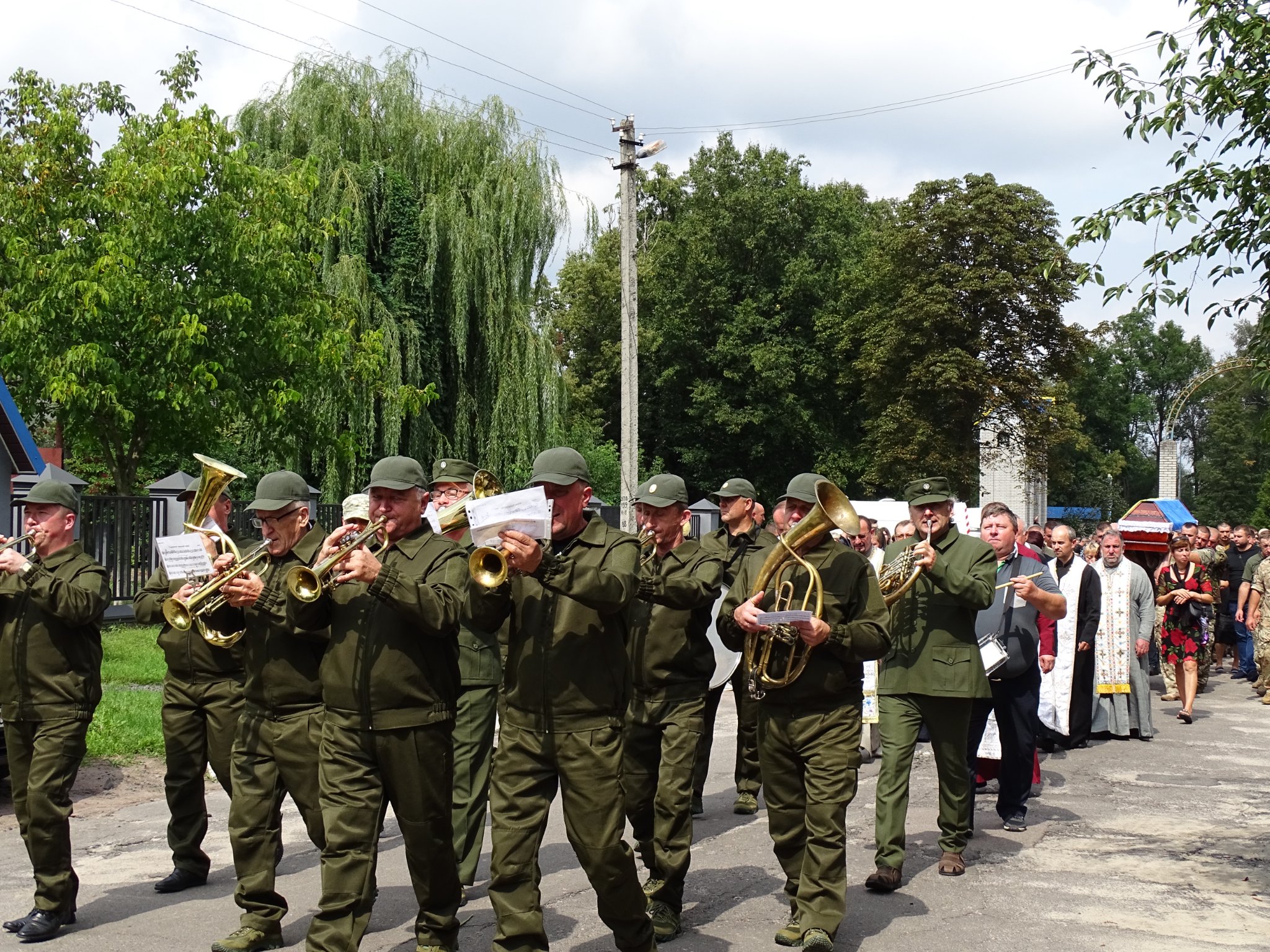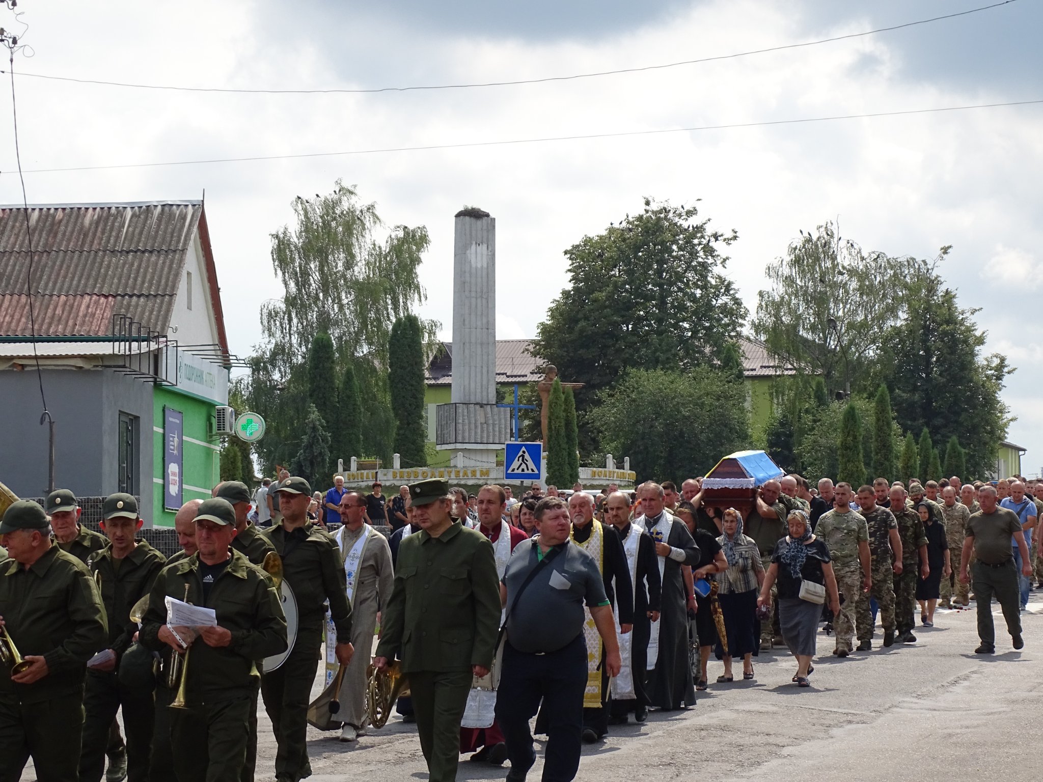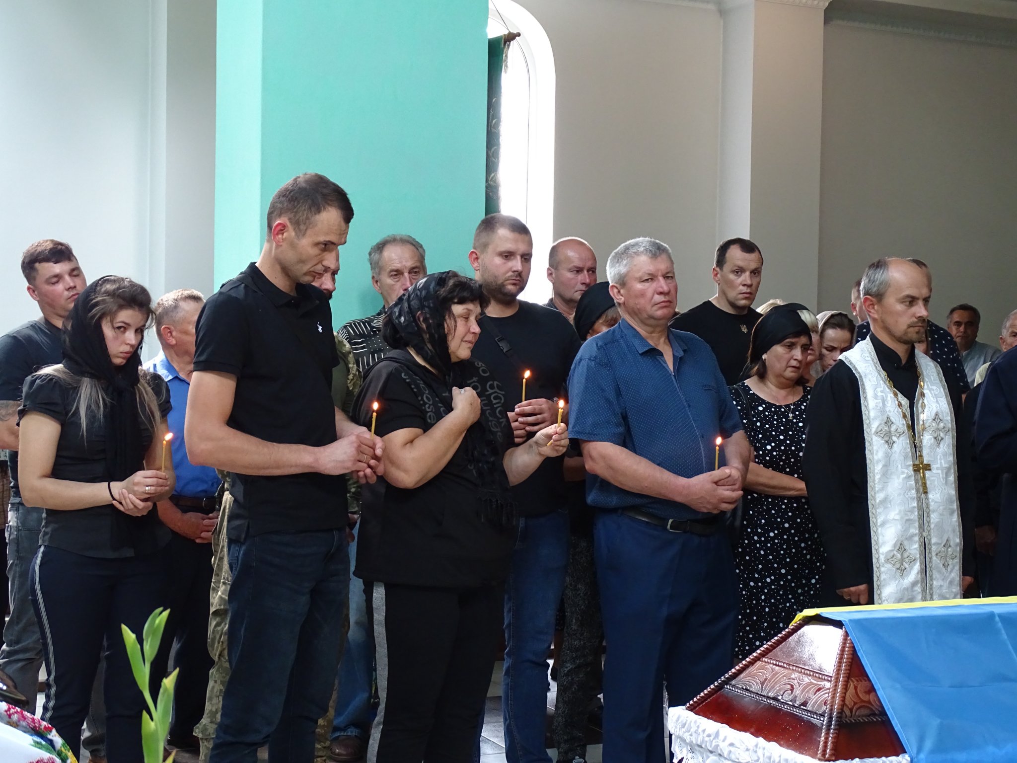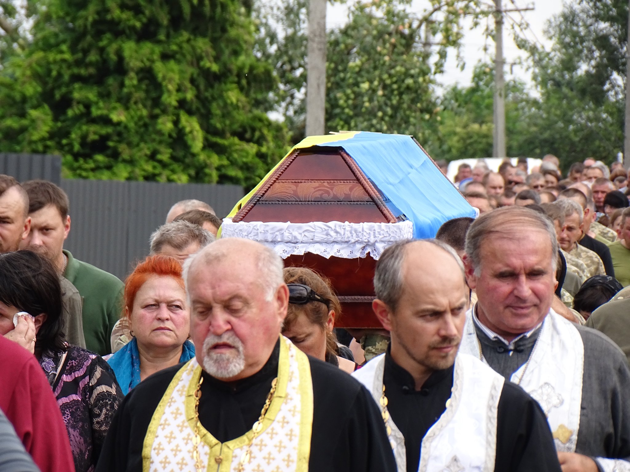 Від рідного дому до місця земного спочинку вулицями рідного селища військові на плечах несли загиблого воїна під звуки духового оркестру. За душу Олександра підносилися молитви. Чин поховання у Свято-Троїцькому храмі звершив митрофорний протоієрей о. Миколай спільно з духовенством деканату.