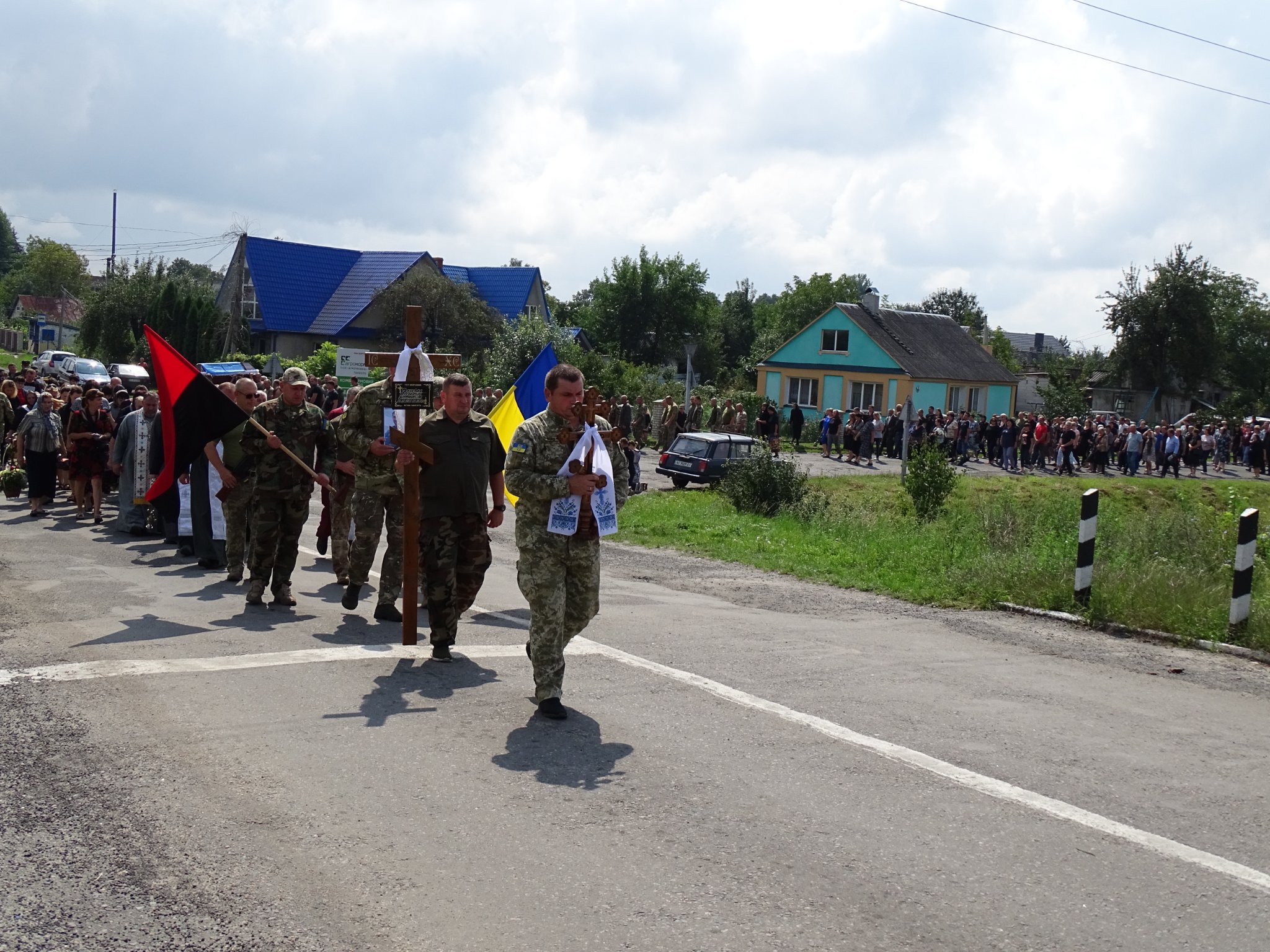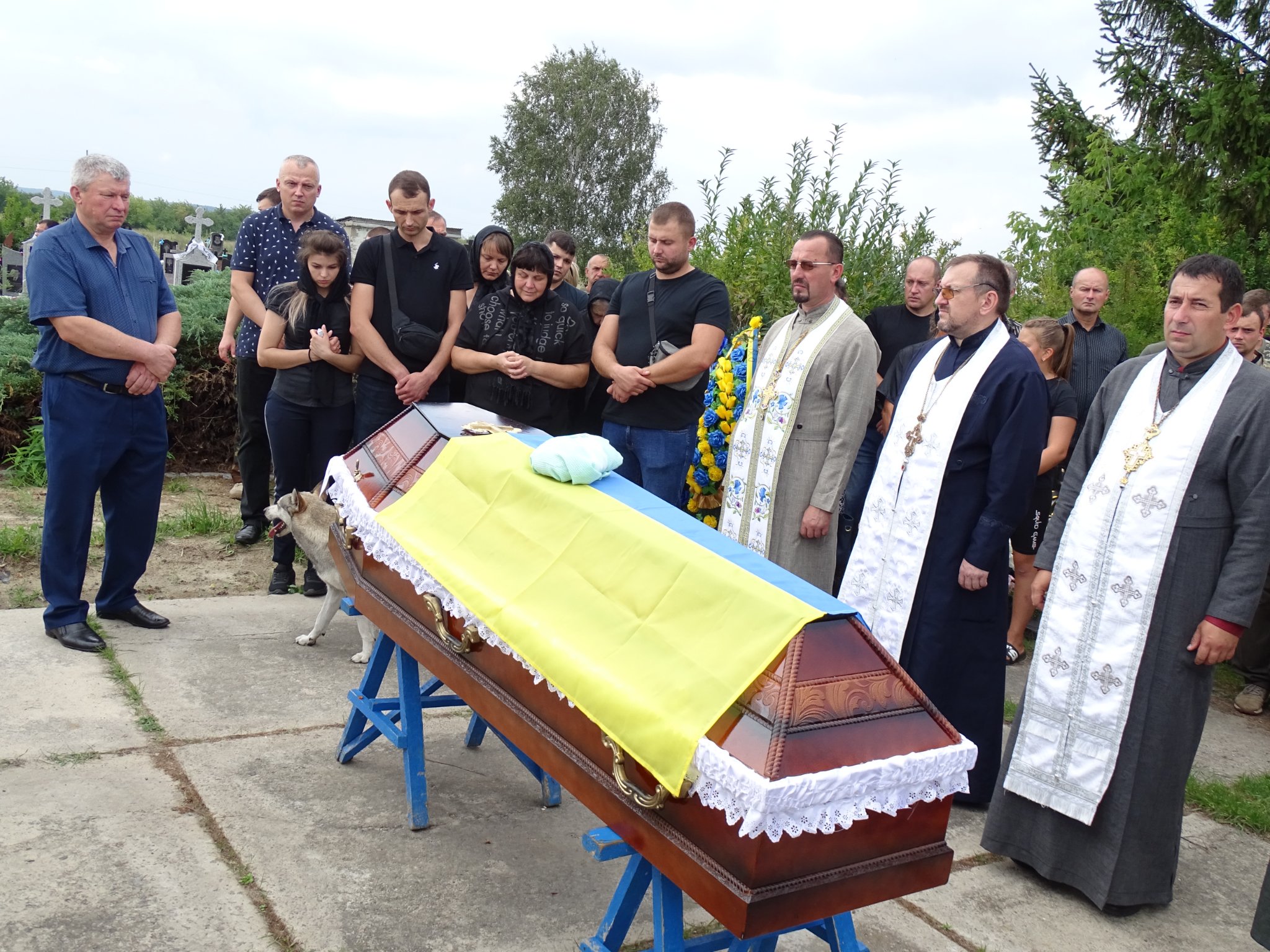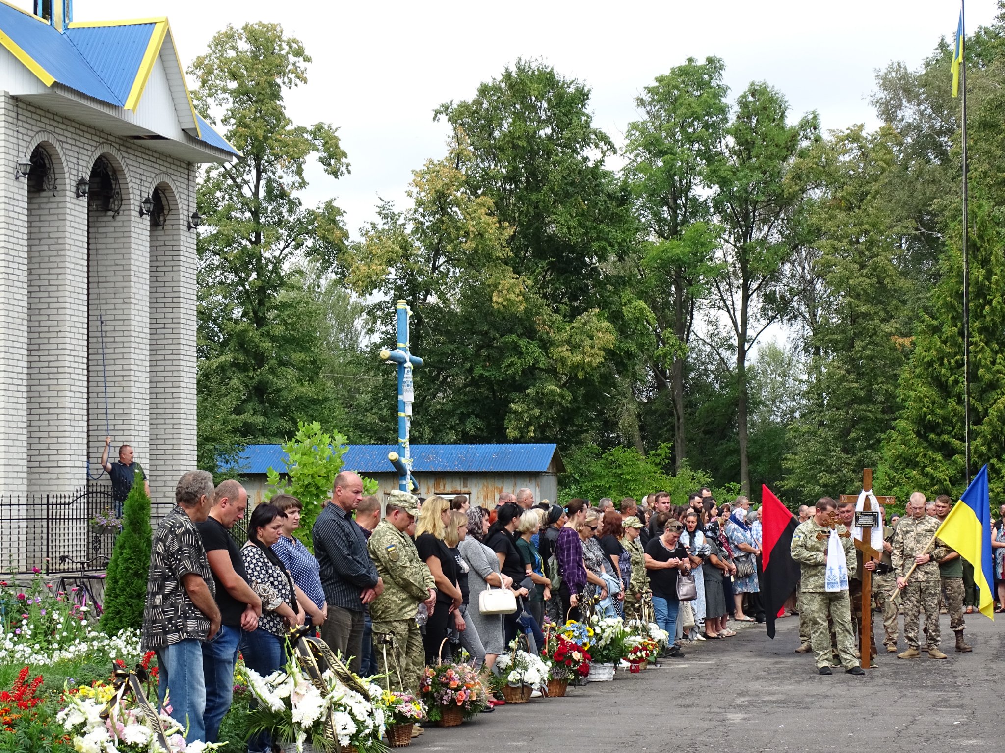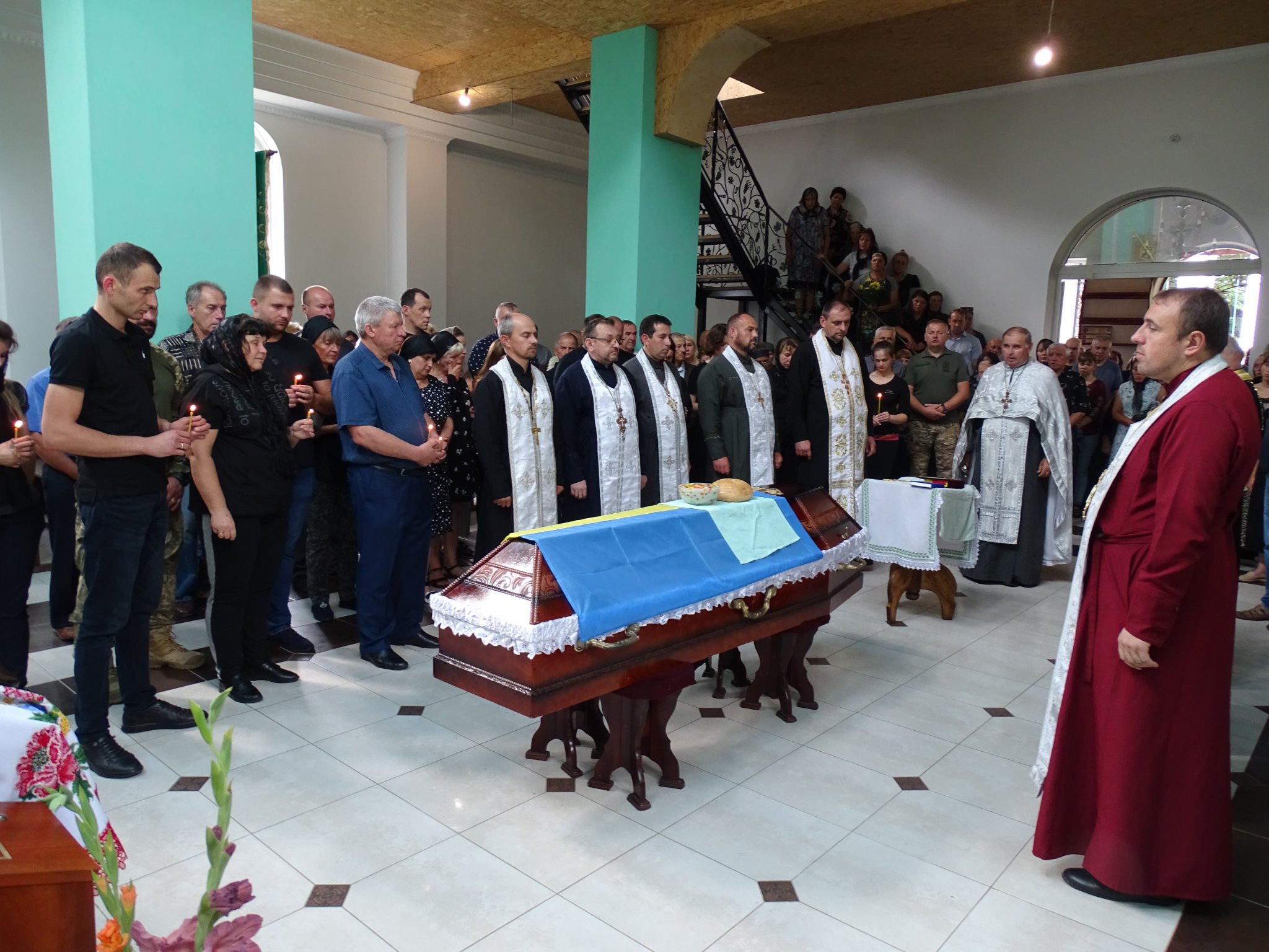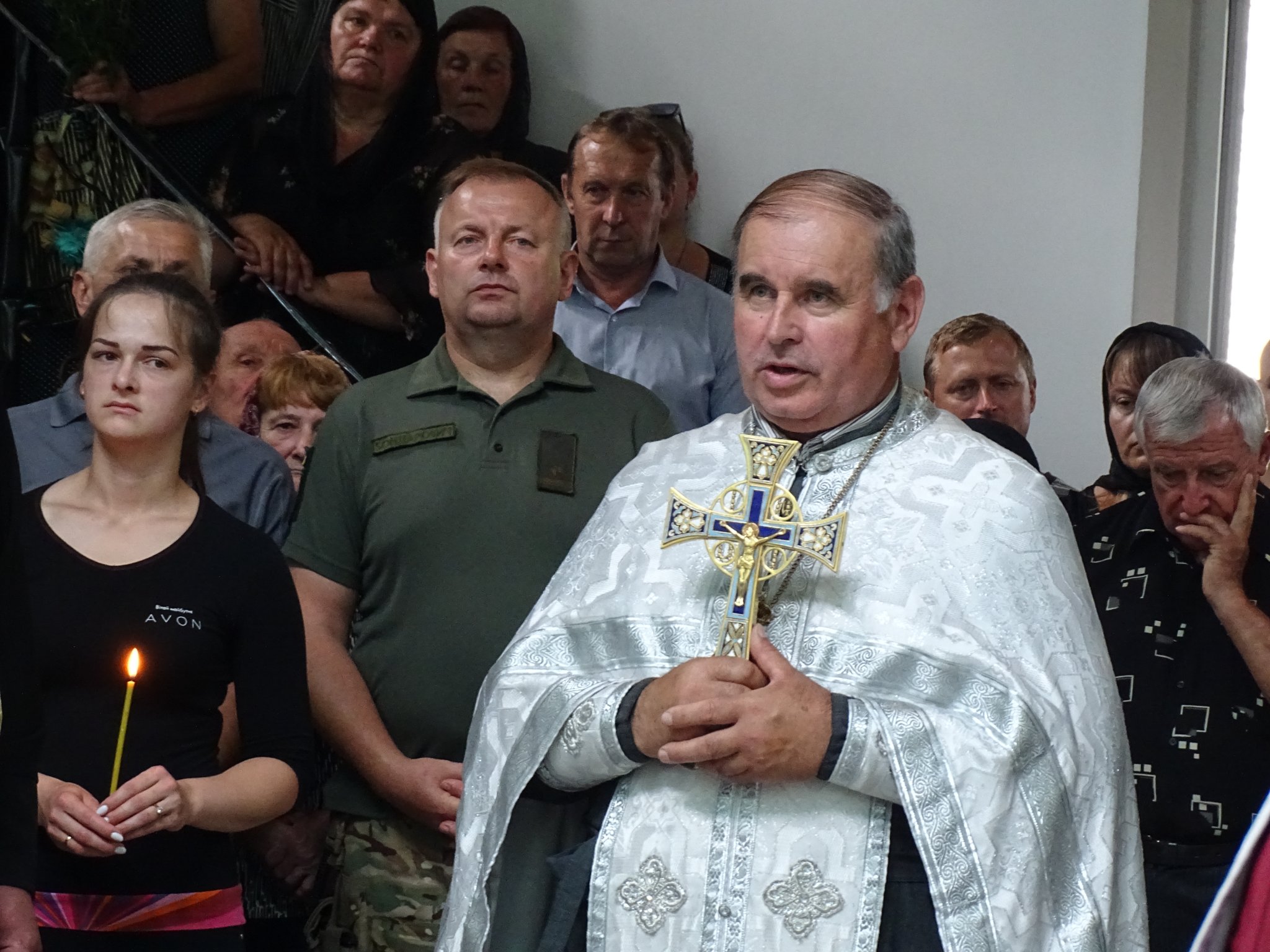 Від рідного дому до місця земного спочинку вулицями рідного селища військові на плечах несли загиблого воїна під звуки духового оркестру. За душу Олександра підносилися молитви. Чин поховання у Свято-Троїцькому храмі звершив митрофорний протоієрей о. Миколай спільно з духовенством деканату.