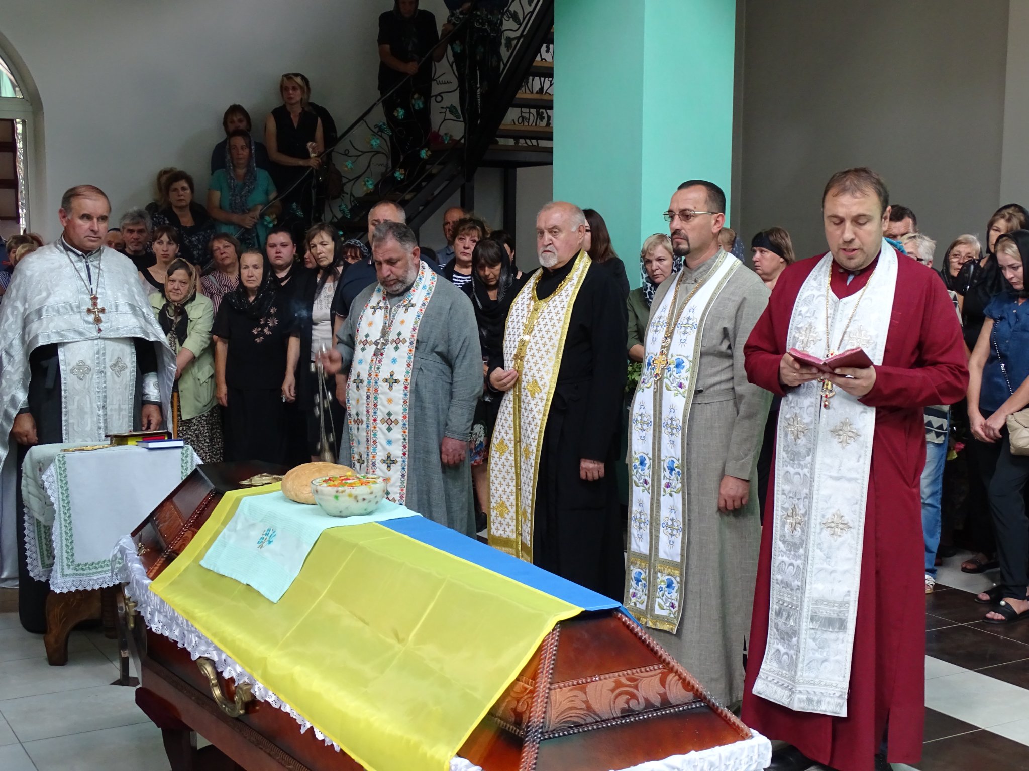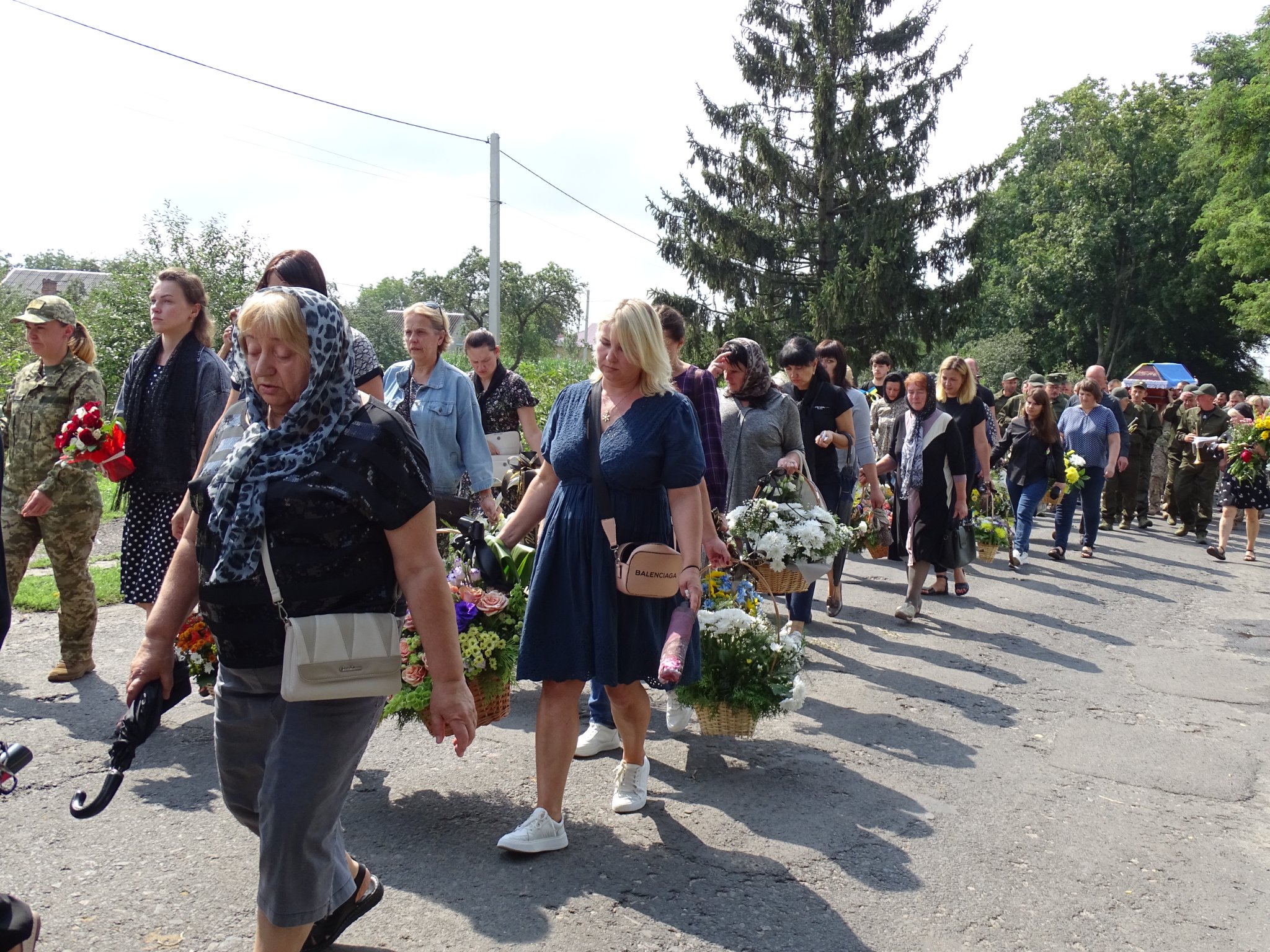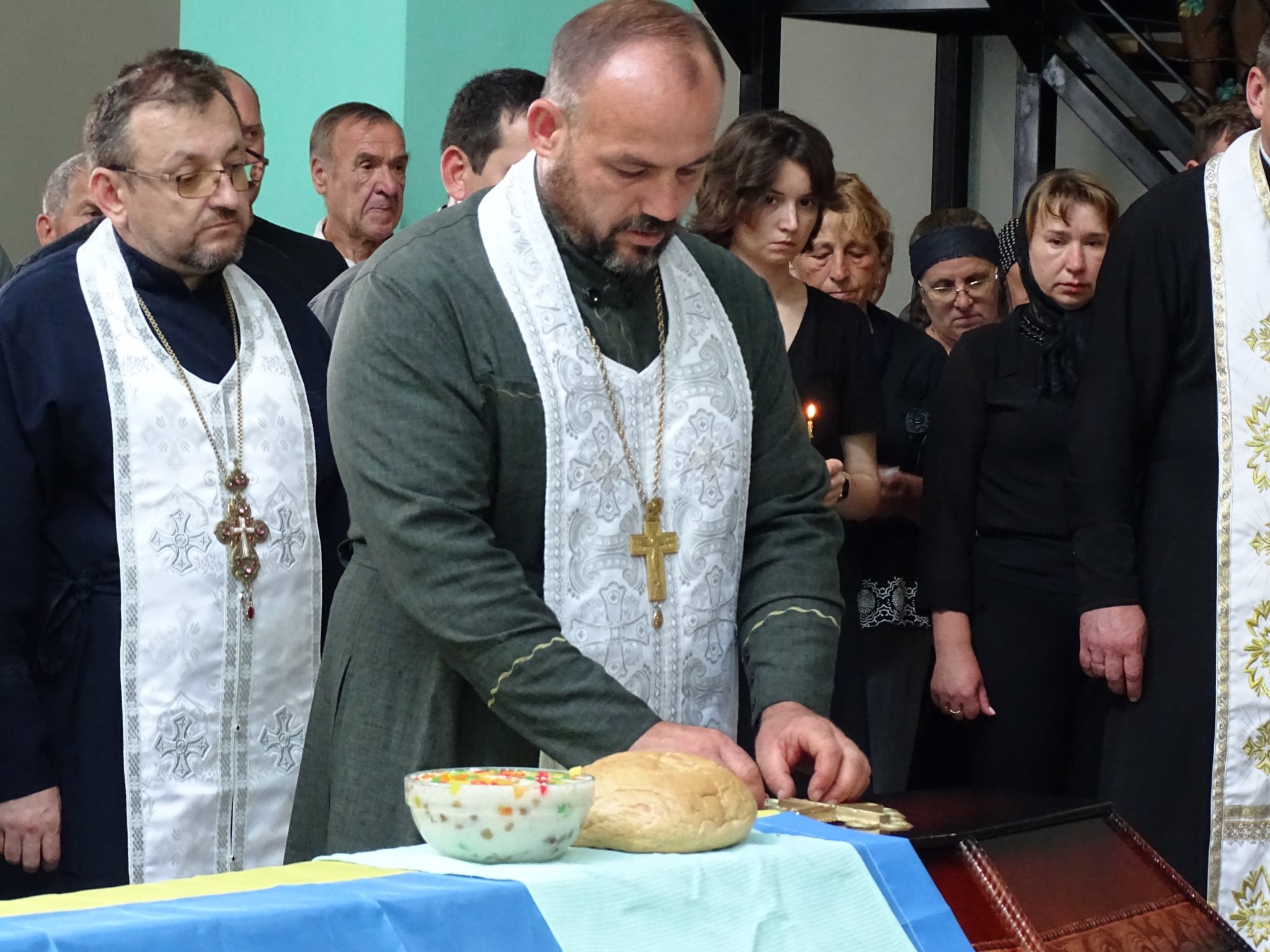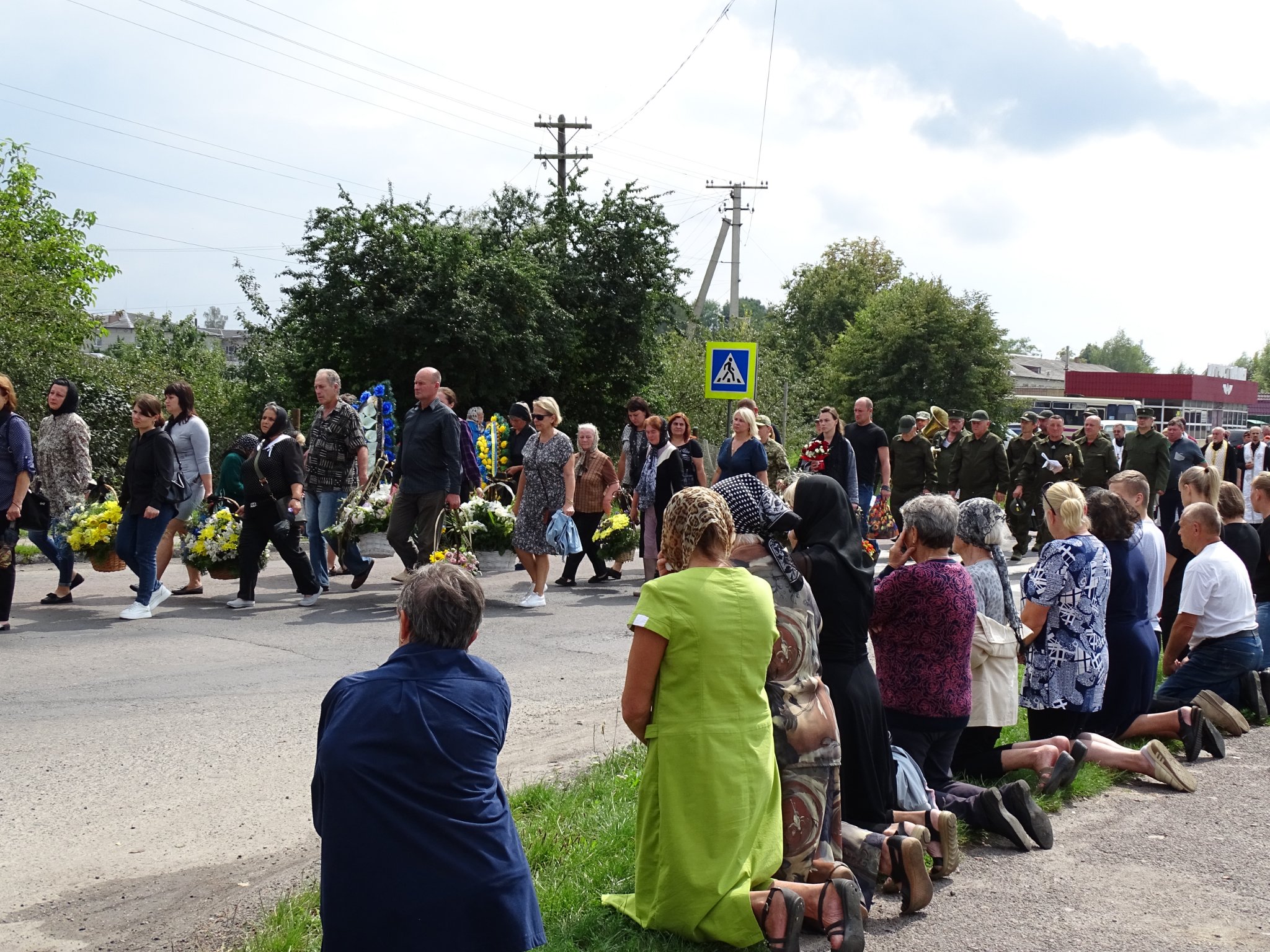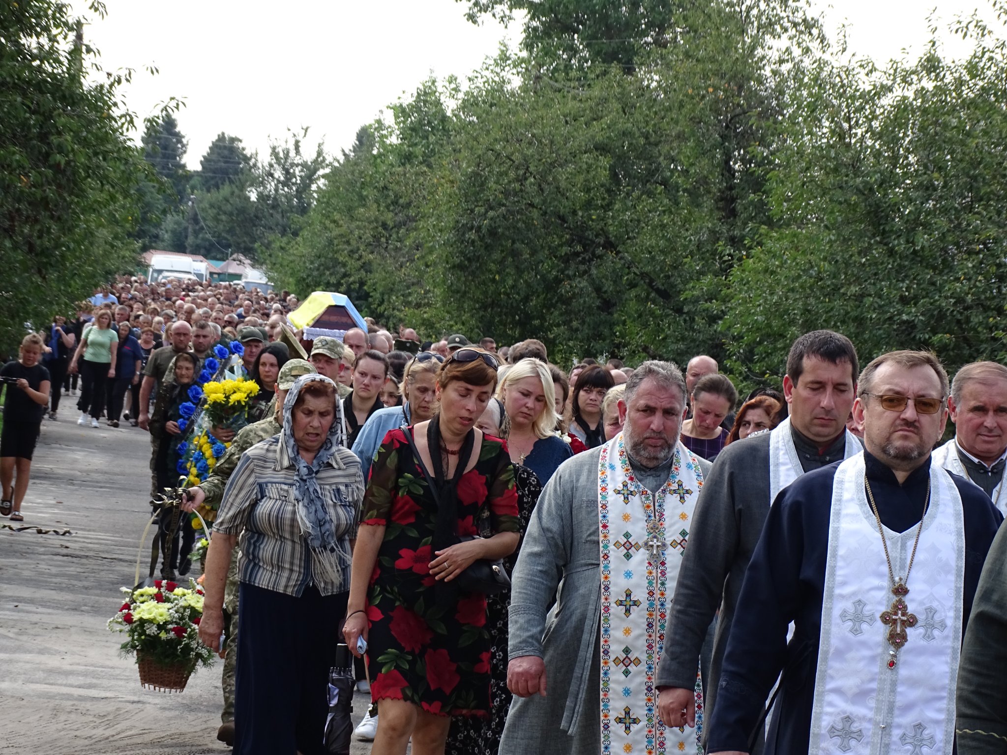 Від рідного дому до місця земного спочинку вулицями рідного селища військові на плечах несли загиблого воїна під звуки духового оркестру. За душу Олександра підносилися молитви. Чин поховання у Свято-Троїцькому храмі звершив митрофорний протоієрей о. Миколай спільно з духовенством деканату.