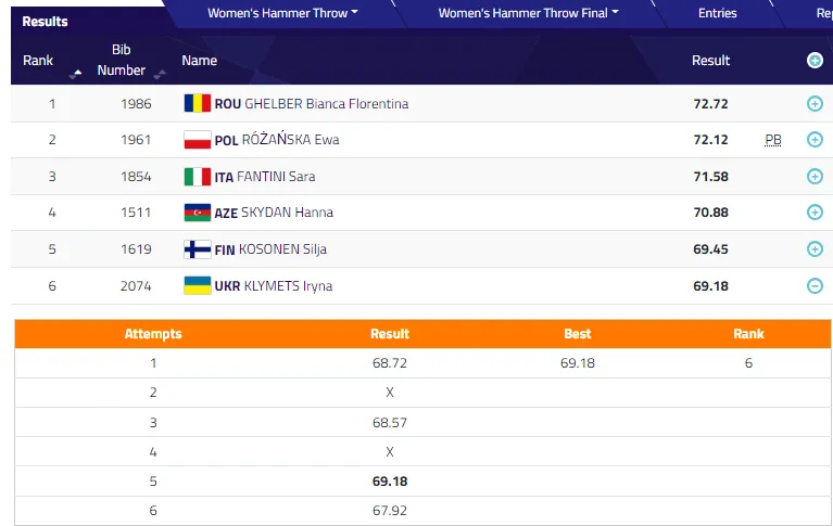 Саме змагання відбулося для Климець успішно. Незважаючи на те, що легкоатлетка залишилася без медалей і посіла 6 місце, вона встановила рекорд України. Наша співвітчизниця кинула снаряд на 68,18 м.